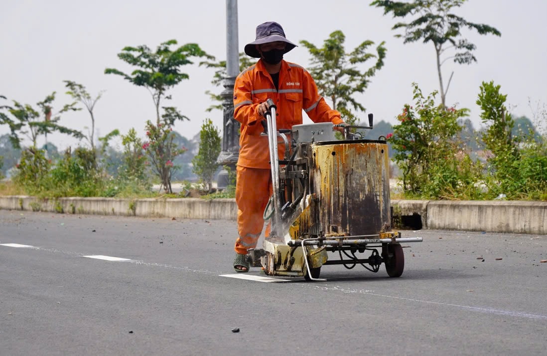 Công nhân làm những công đoạn cuối để tuyến đường thông xe toàn tuyến vào thời điểm trước Tết Nguyên đán 2026. Ảnh: Nghiêm Ý.