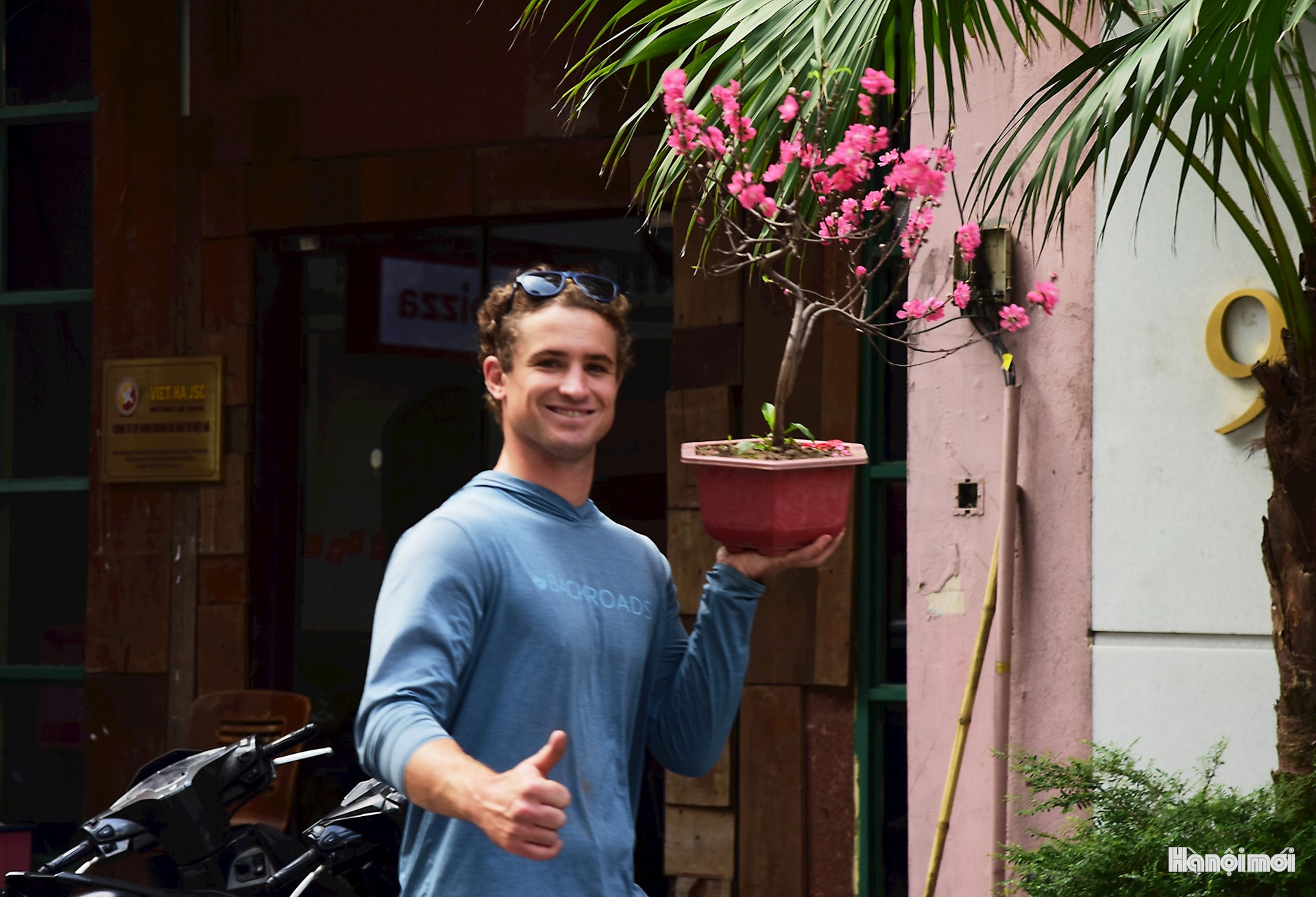 Một du khách nước ngoài hào hứng khi lựa chọn được cây đào nhỏ để cùng đón Tết cổ truyền của người Việt.