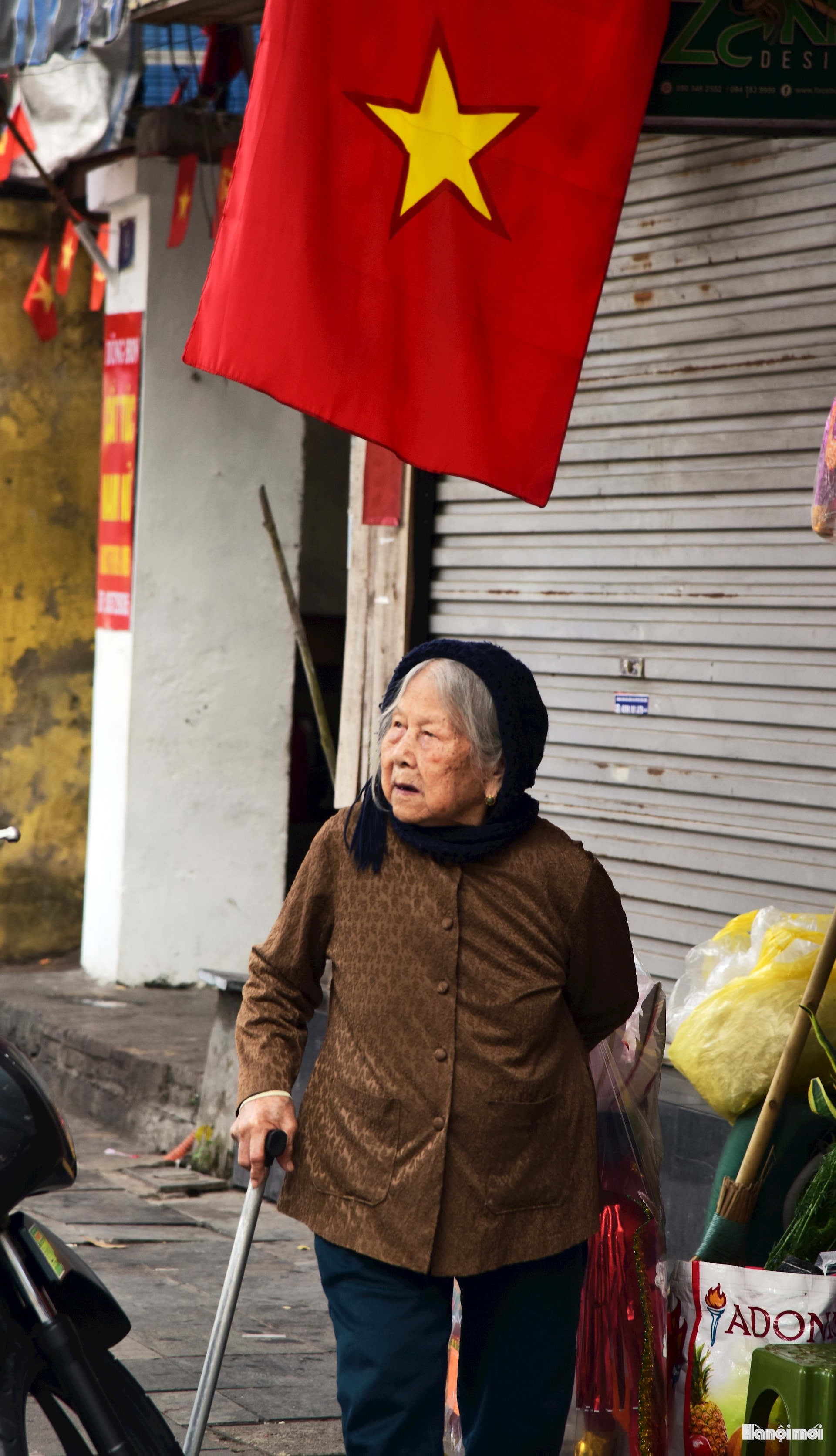 Một người cao tuổi dạo phố sớm, bồi hồi nhớ lại không khí Tết xưa.