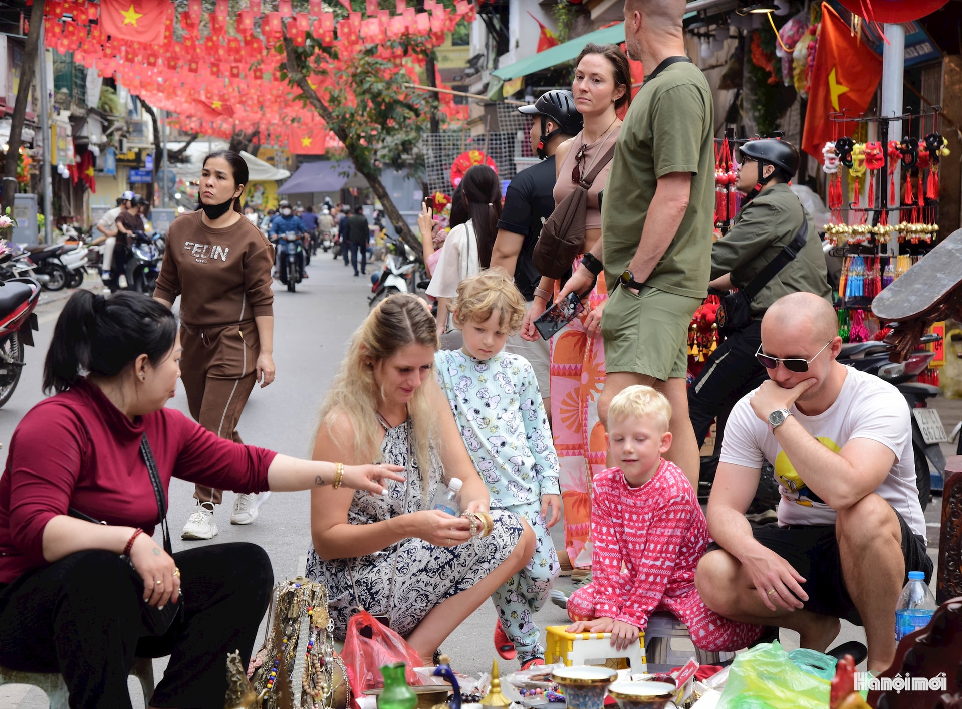 Một gia đình du khách người nước ngoài tìm hiểu những sản phẩm được bày bán tại chợ Hoa Hàng Lược.