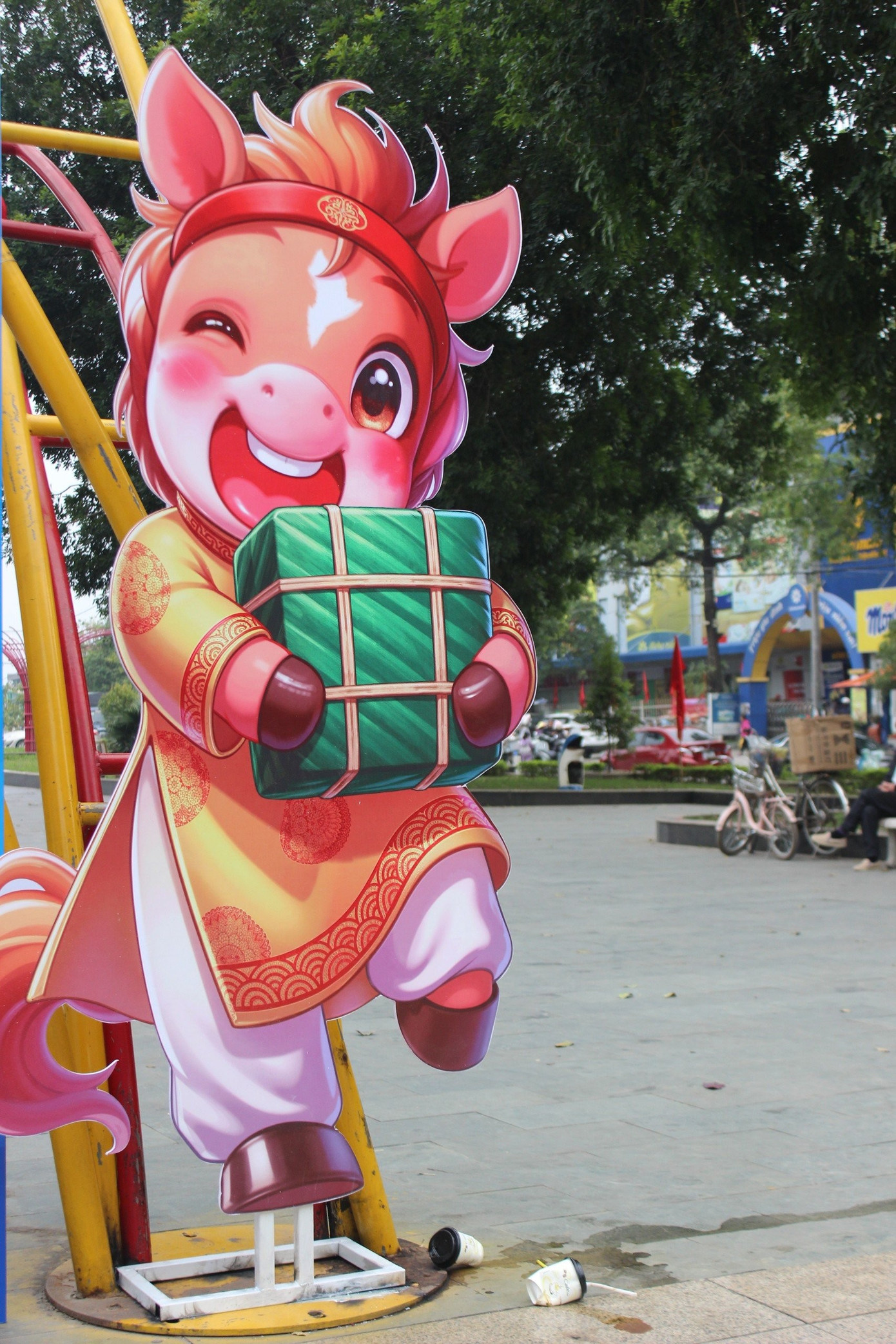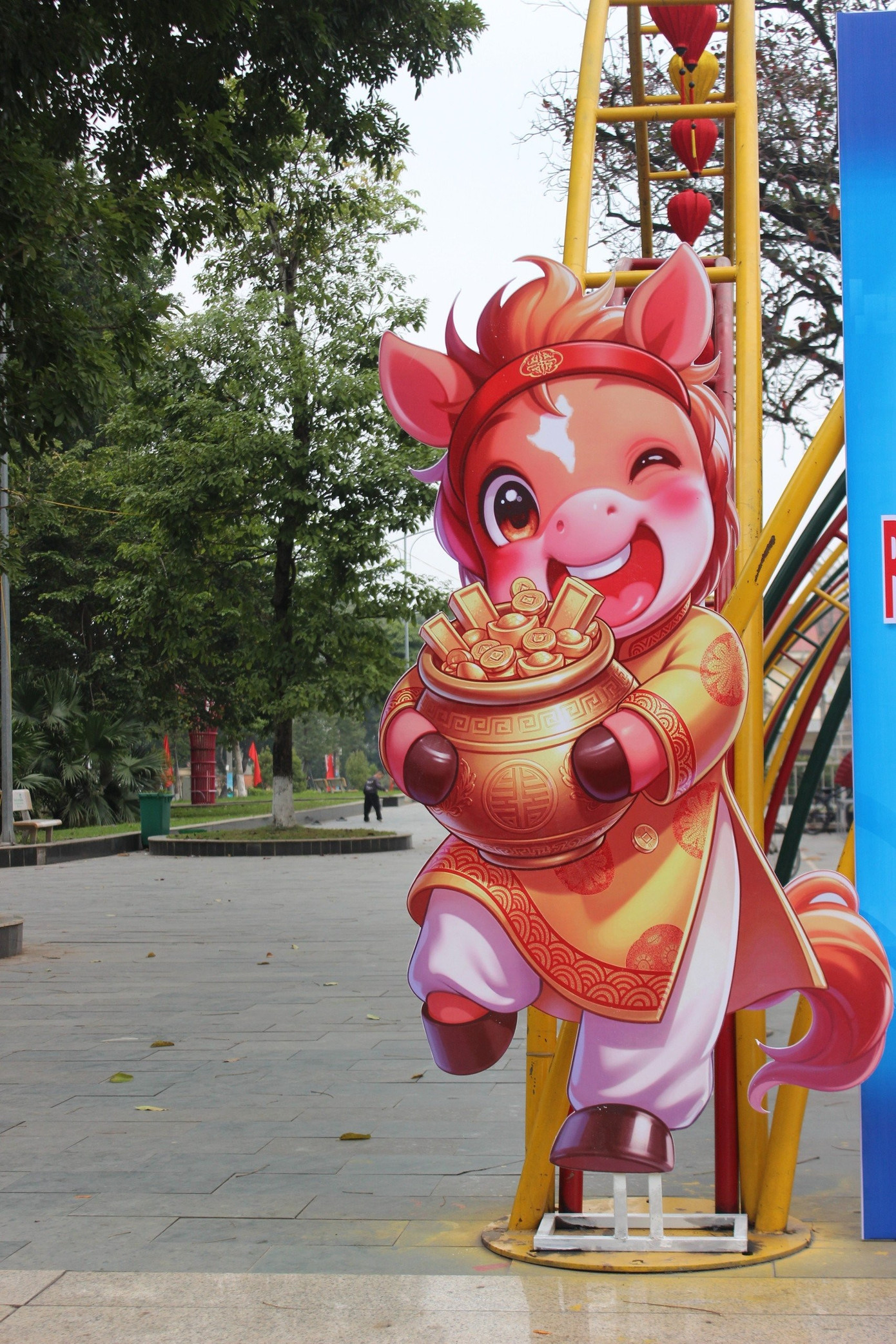 Ở không gian vui chơi công cộng, hình ảnh linh vật ngựa được thể hiện theo phong cách hoạt hình gần gũi, tươi vui, ôm trọn thỏi vàng may mắn – một cách tiếp cận thân thiện, hướng tới trẻ em và gia đình, làm cho sắc xuân thêm sinh động. Hình ảnh chụp tại phường Phú Thọ.