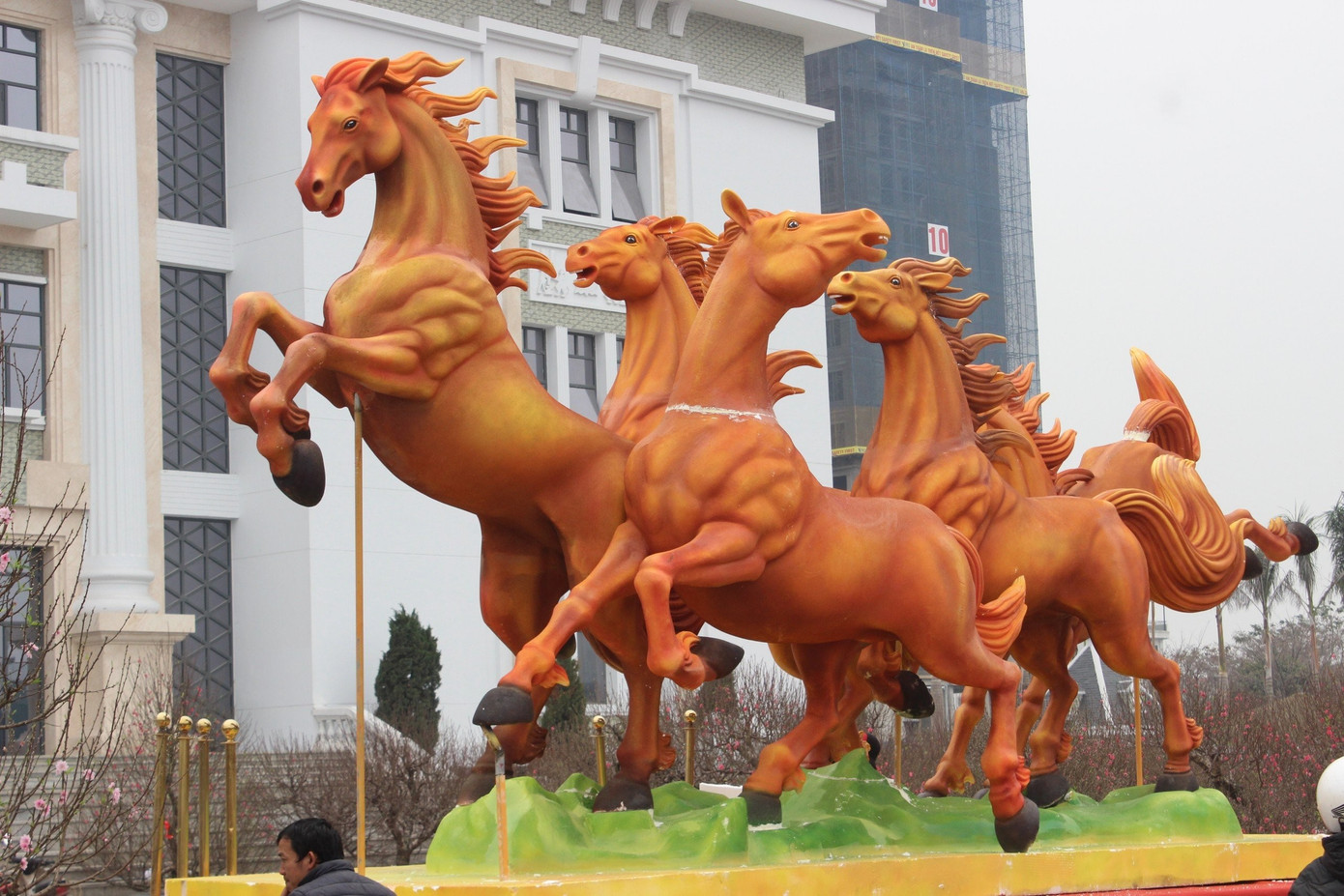 Cụm linh vật gồm năm chú ngựa trong tư thế “phi mã”, tạo hình mạnh mẽ, dứt khoát, như đang lướt trên nền mây và núi. Linh vật năm Bính Ngọ tại Phú Thọ được thể hiện theo lối tả thực, chú trọng vào vẻ đẹp cơ bắp và thần thái dũng mãnh. Tông màu chủ đạo là cam đất chuyển vàng đồng, gợi liên tưởng đến sự sung túc, thịnh vượng và khí thế bứt phá trong năm mới.