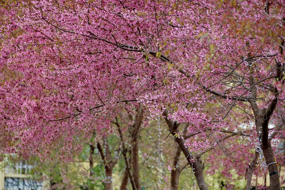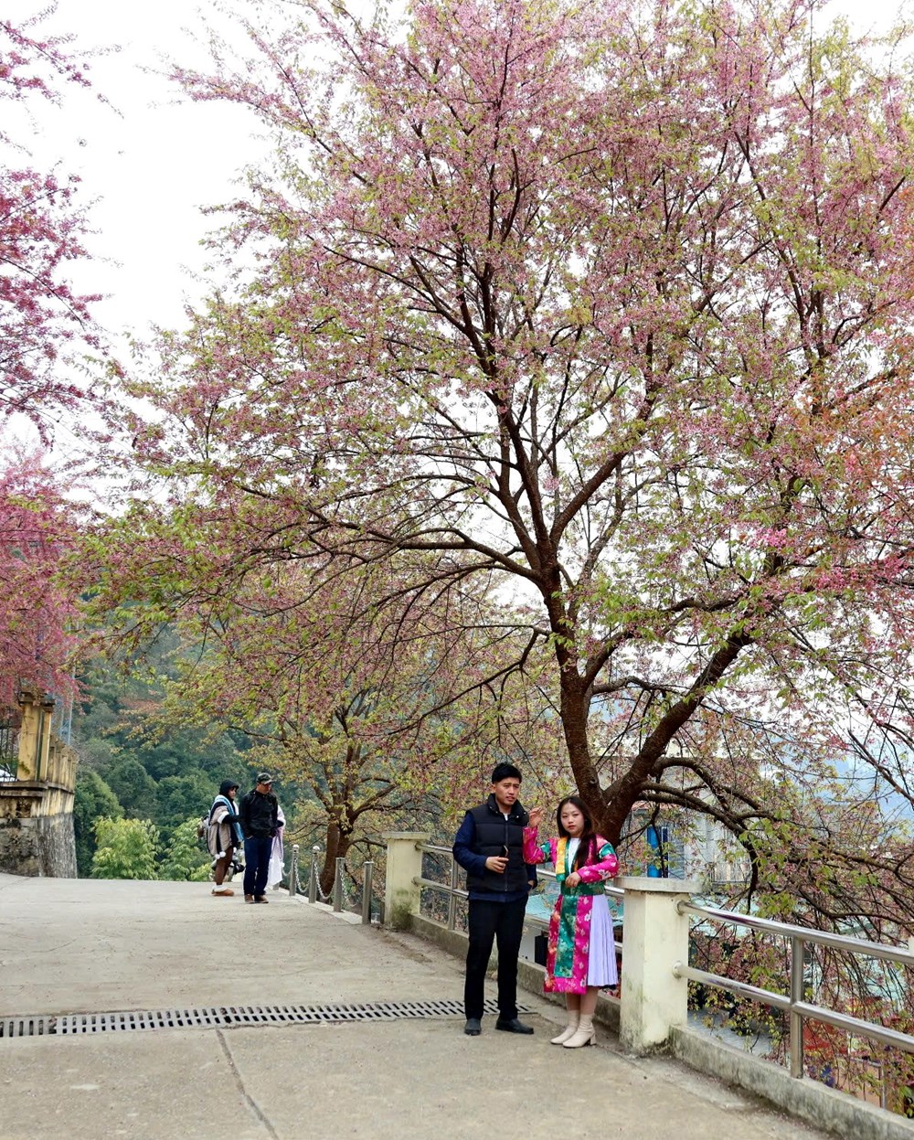 Dưới chân Cột cờ Lũng Cú, những tán hoa khoe sắc như một nét vẽ mềm mại. Phóng tầm mắt ra xa, du khách sẽ bắt gặp hình ảnh hoa anh đào phủ bóng yên bình lên khuôn viên Đồn biên phòng Lũng Cú.