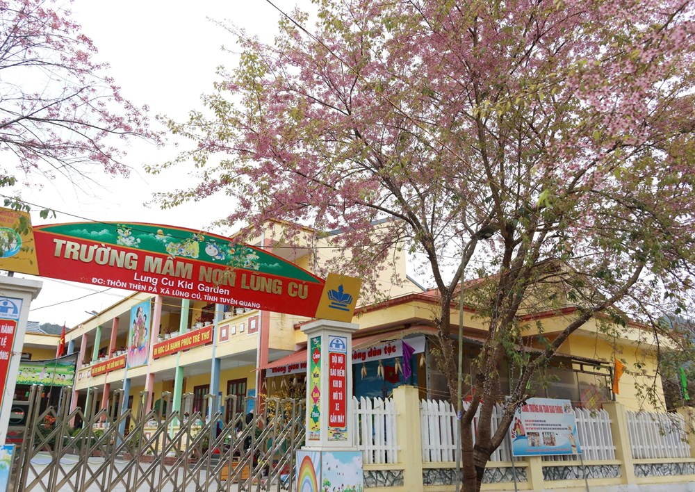 Hoa anh đào cũng khoe sắc rực rỡ ngay trước cổng trường mầm non Lũng Cú, mang không khí xuân ấm áp tràn ngập không gian học đường vùng cao.