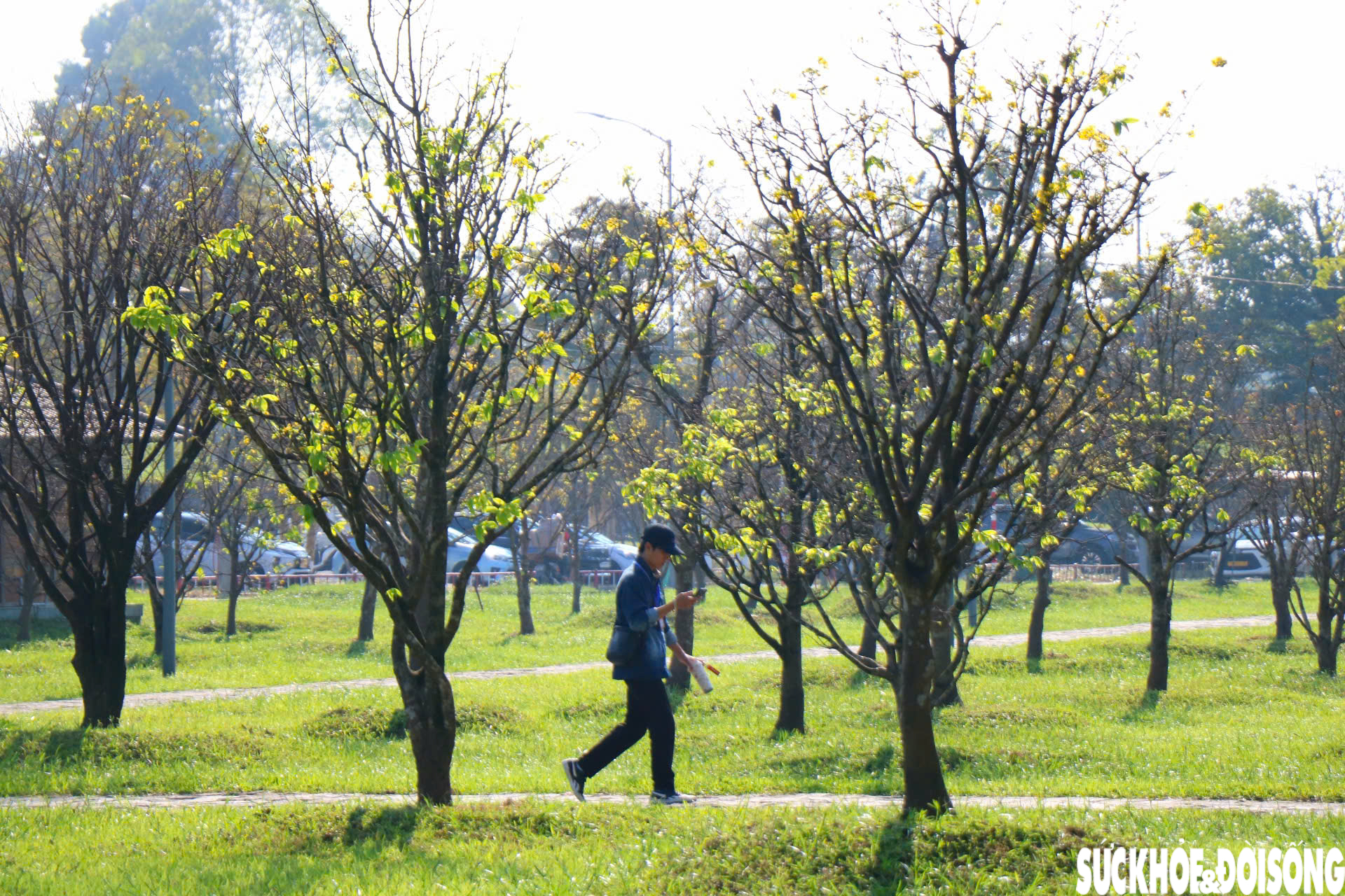 Dưới tán mai vàng, nhiều người dân và du khách dừng lại ngắm hoa, chụp ảnh, tận hưởng không khí xuân sớm.