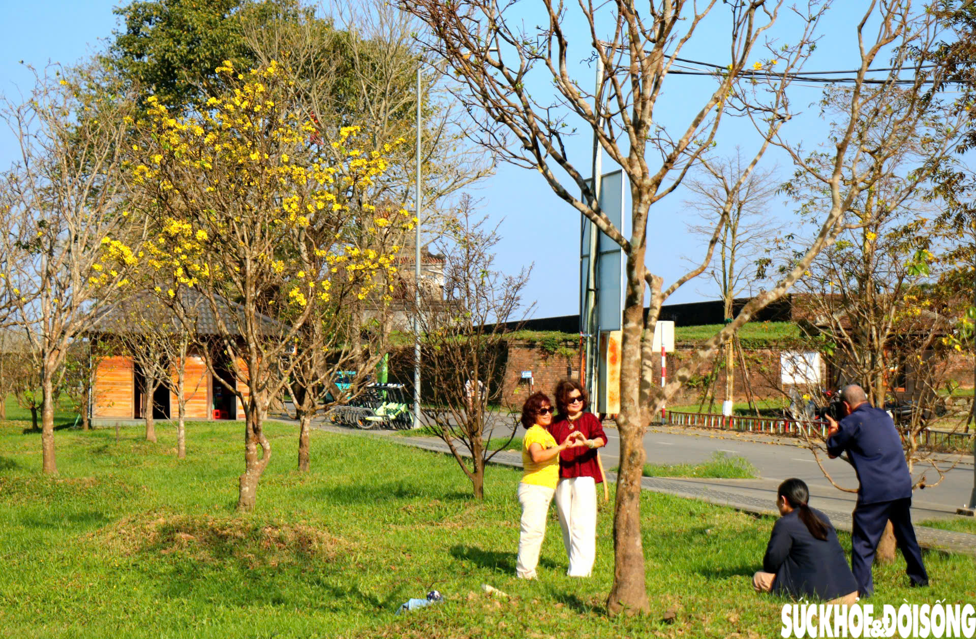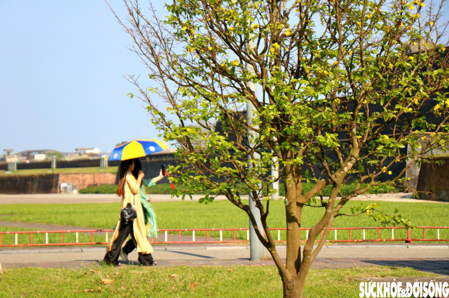 Từng hàng mai thẳng tắp trải dài trước di tích Huế, tạo nên một dải màu vàng tươi tắn tô điểm cho không gian Kinh thành vốn trầm mặc.
