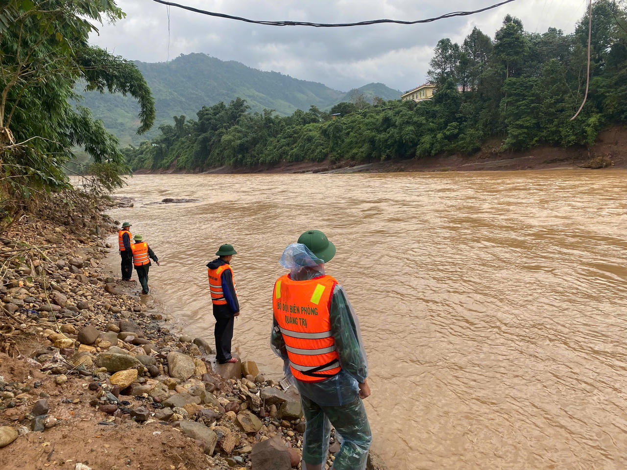 Bộ đội Biên phòng tìm kiếm tài xế bị lũ cuốn trôi mất tích ven bờ sông Đakrông.
