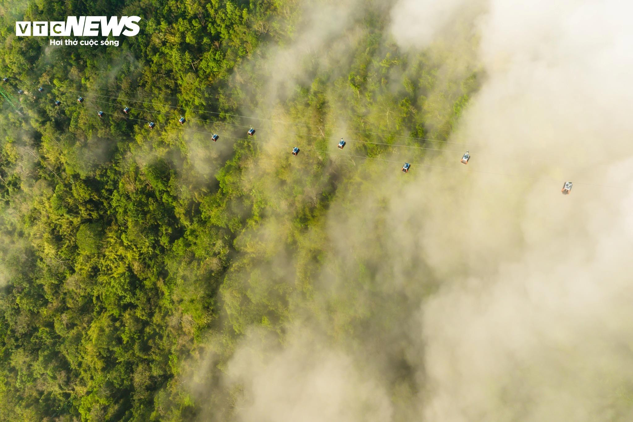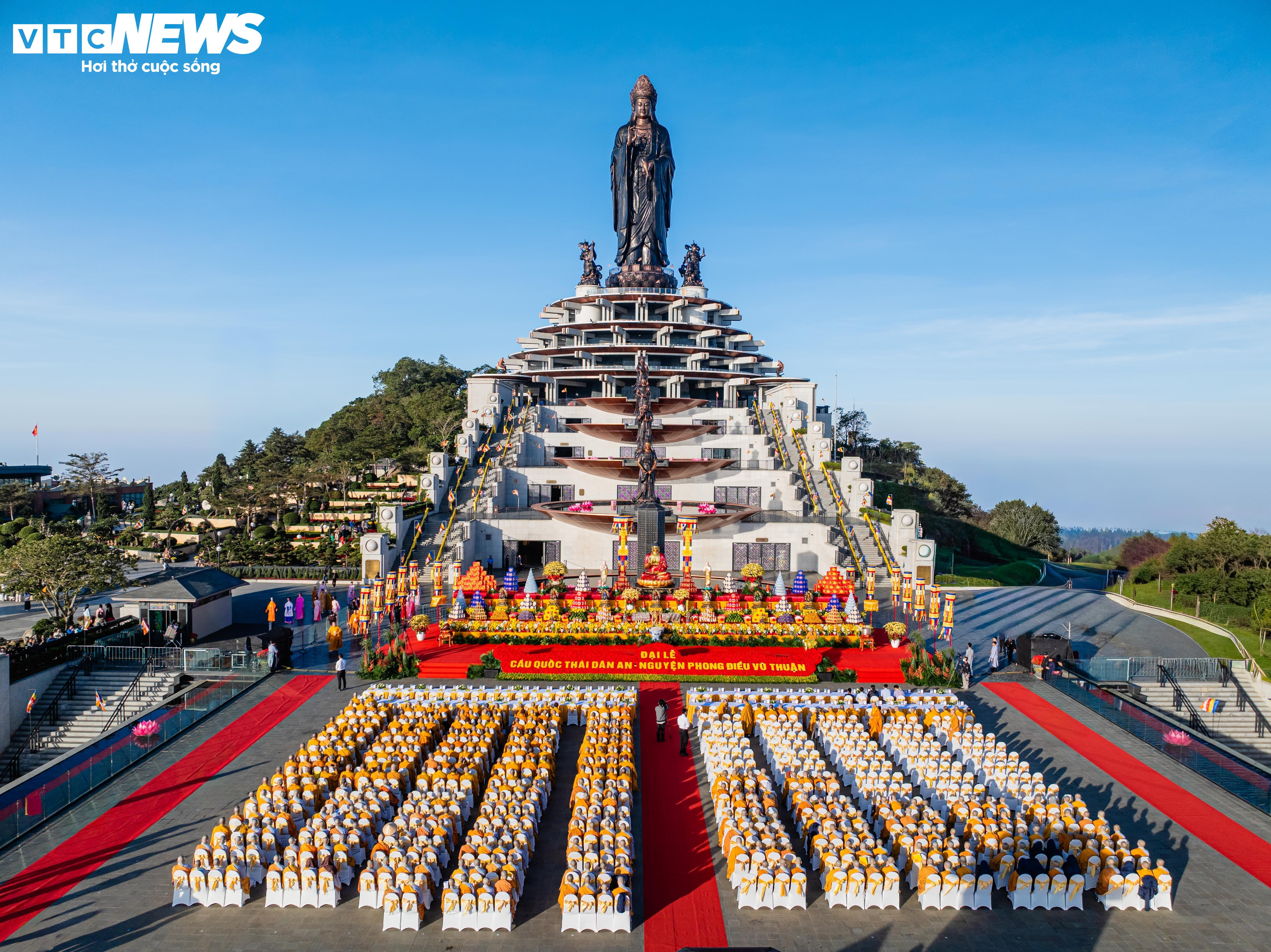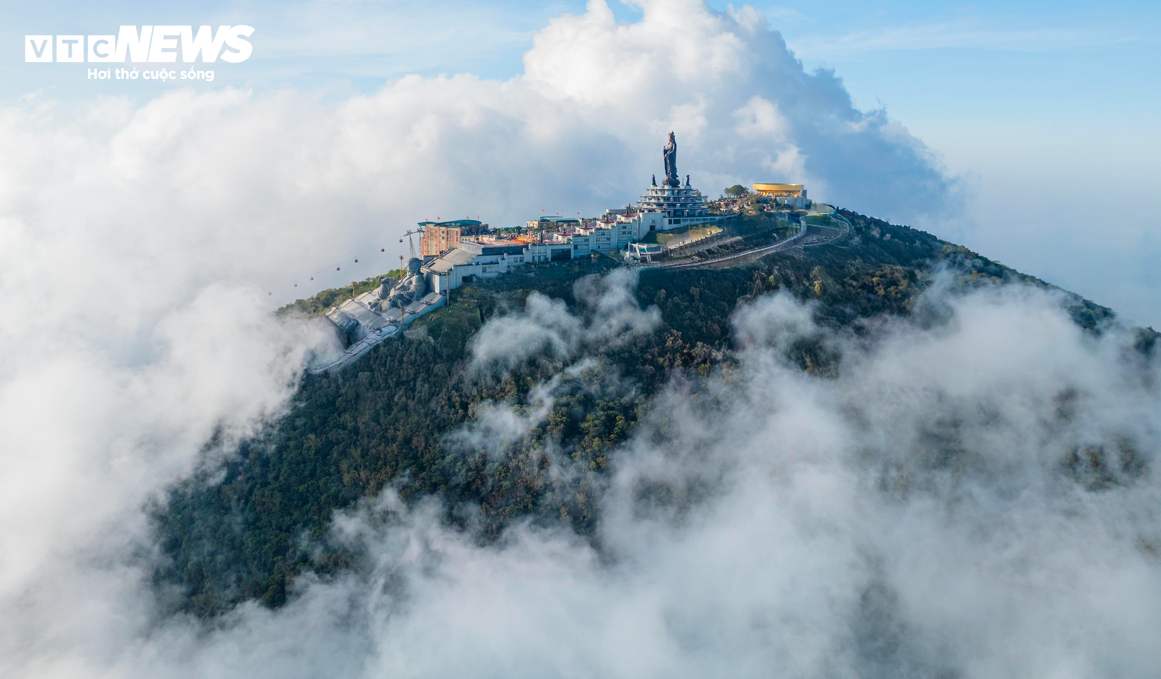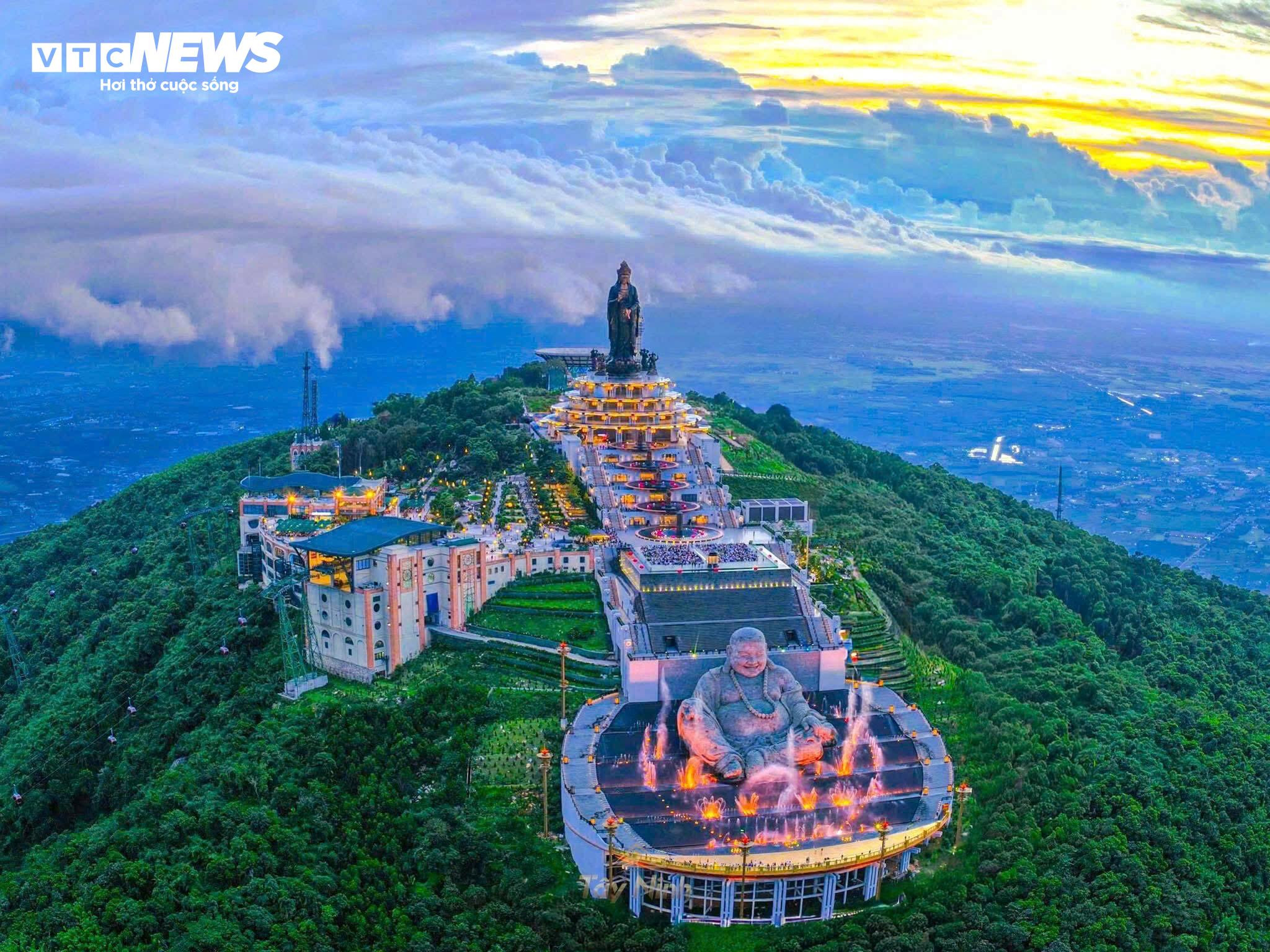 Từ trên cao, quần thể khu du lịch tâm linh trên đỉnh núi dần hiện ra giữa biển mây. Các công trình được bố trí trải rộng nhưng hài hòa với địa hình tự nhiên.