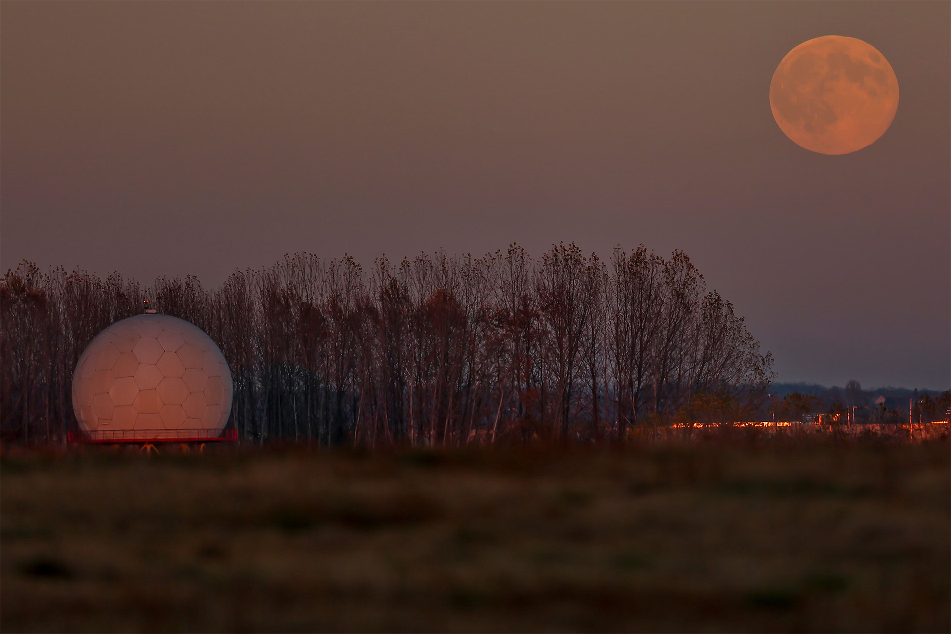 Mặt Trăng tròn xuất hiện phía sau khu rừng, ánh sáng dịu nhưng rực rỡ. Ảnh: Frank Hammerschmidt / dpa