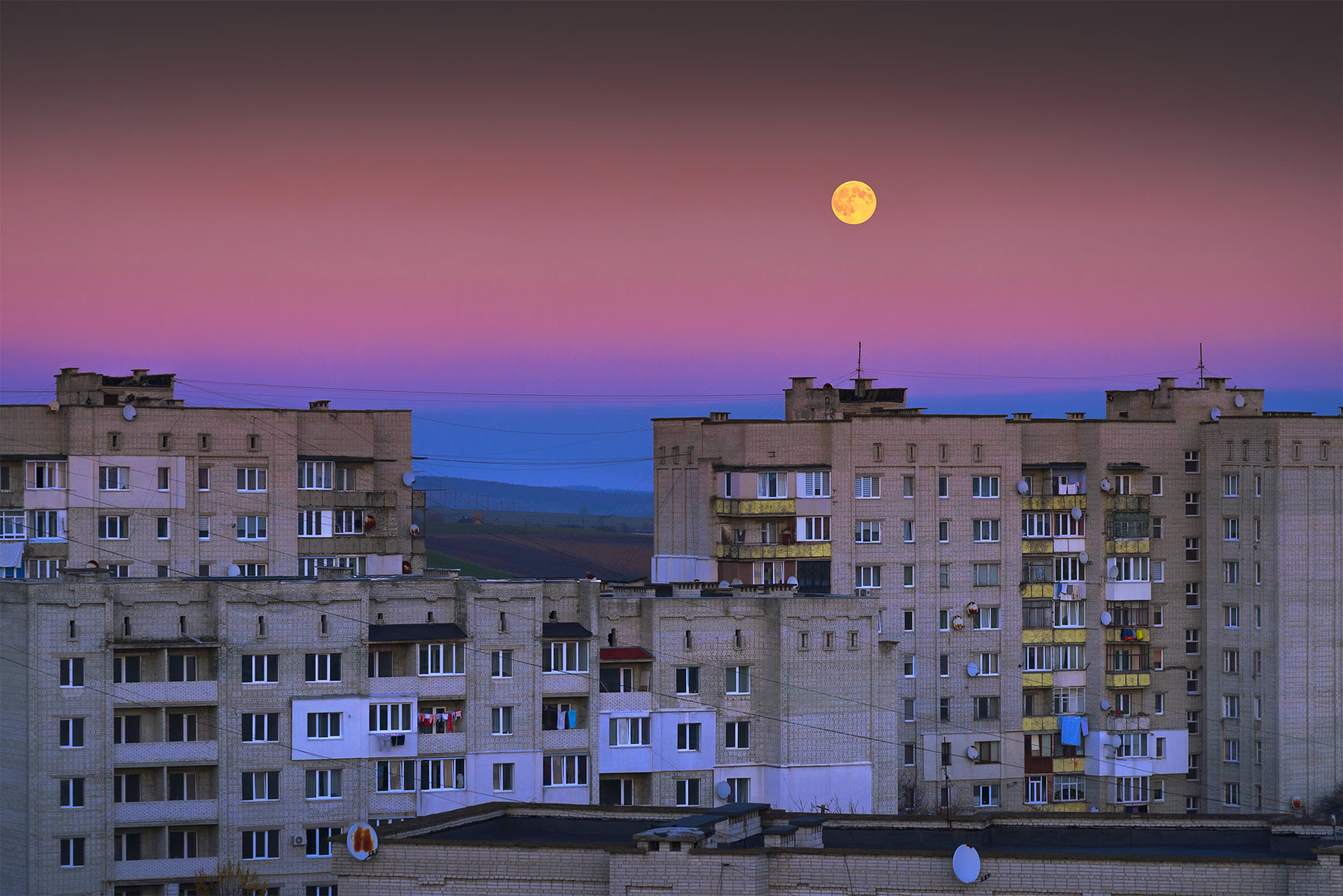 Mặt Trăng lên cao sau những tòa chung cư, tạo nên khung cảnh quen thuộc nhưng đầy thơ mộng. Ảnh: Artur Abramiv / ZUMA Press Wire / Shutterstock