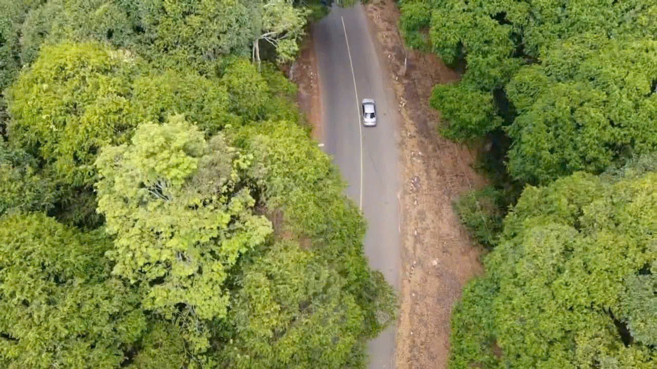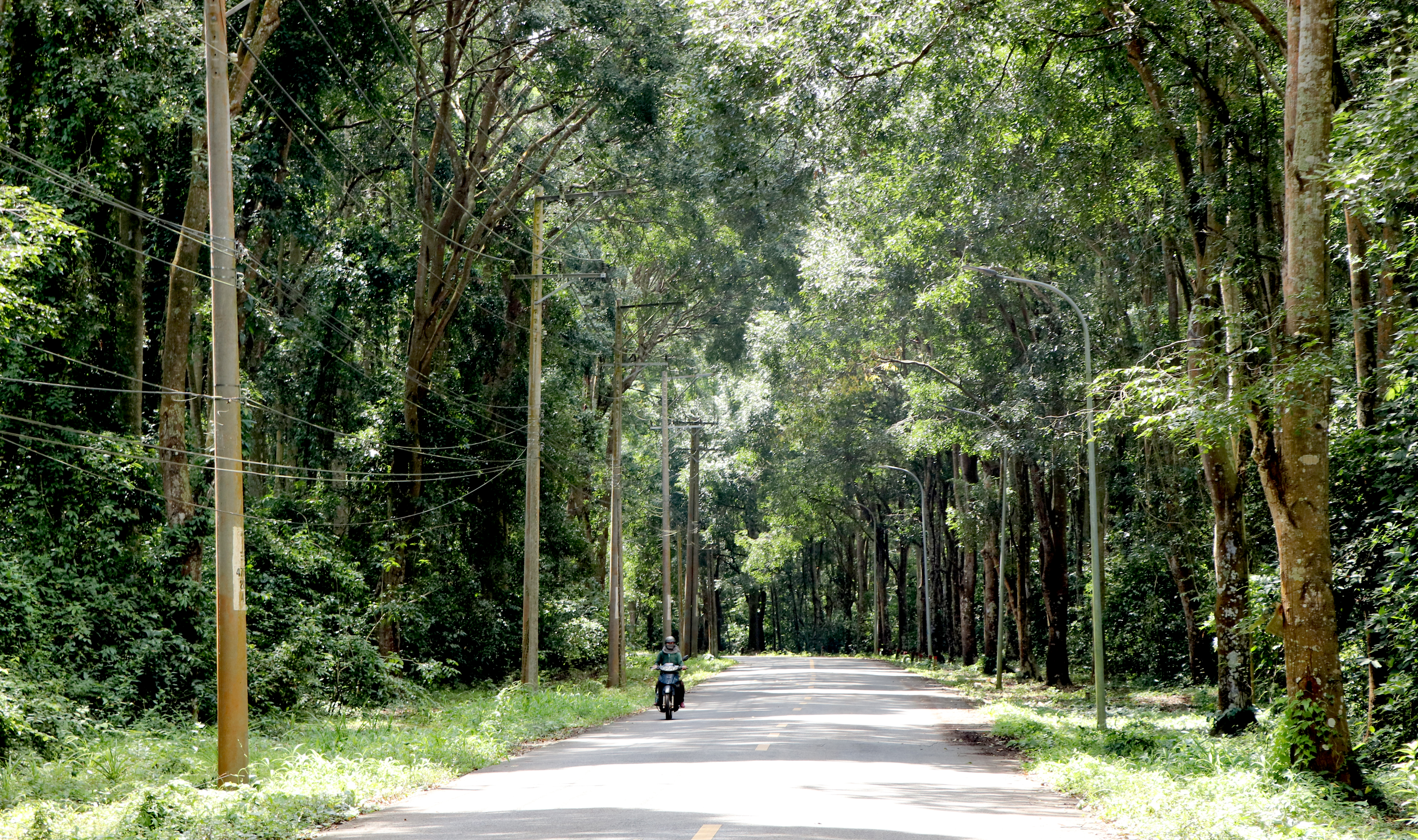 Đường Đá Bạc - Xuân Sơn băng qua rừng phòng hộ Xuân Sơn lúc nào cũng rợp bóng cây, xanh mát. Ảnh: QUANG VŨ