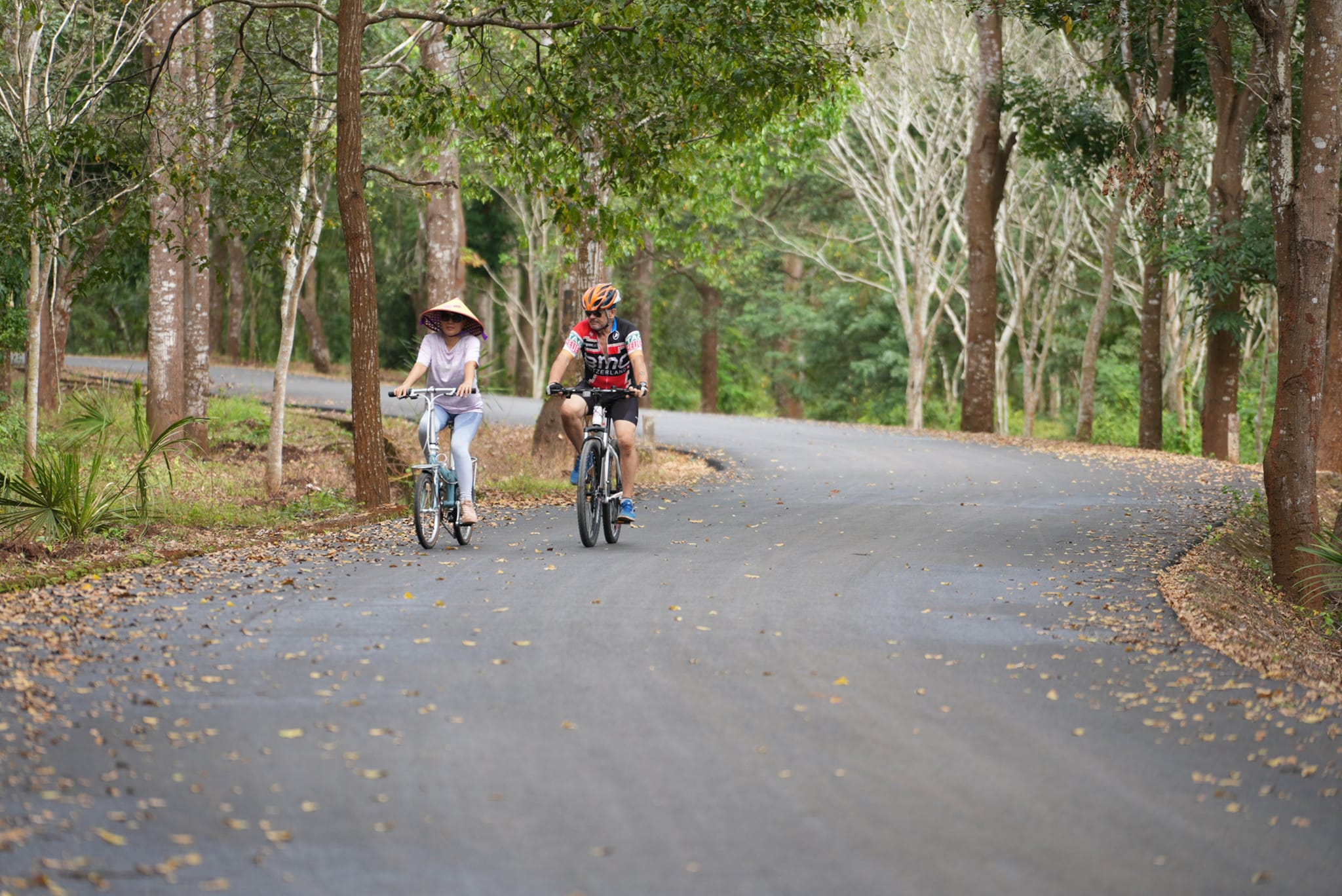 Khách du lịch đạp xe dưới những con đường nhựa chạy qua rừng Xuân Sơn. Ảnh: QUANG VŨ