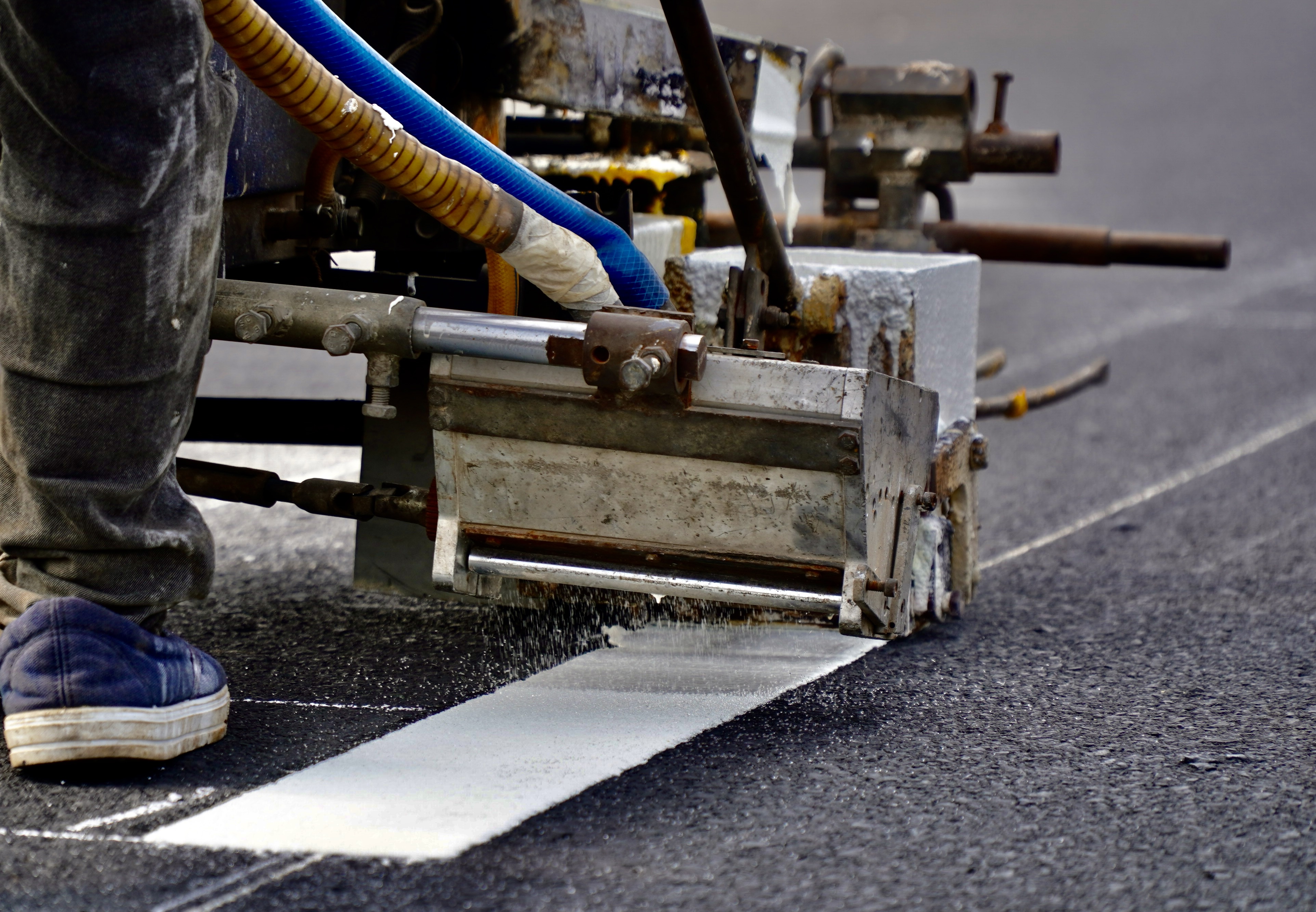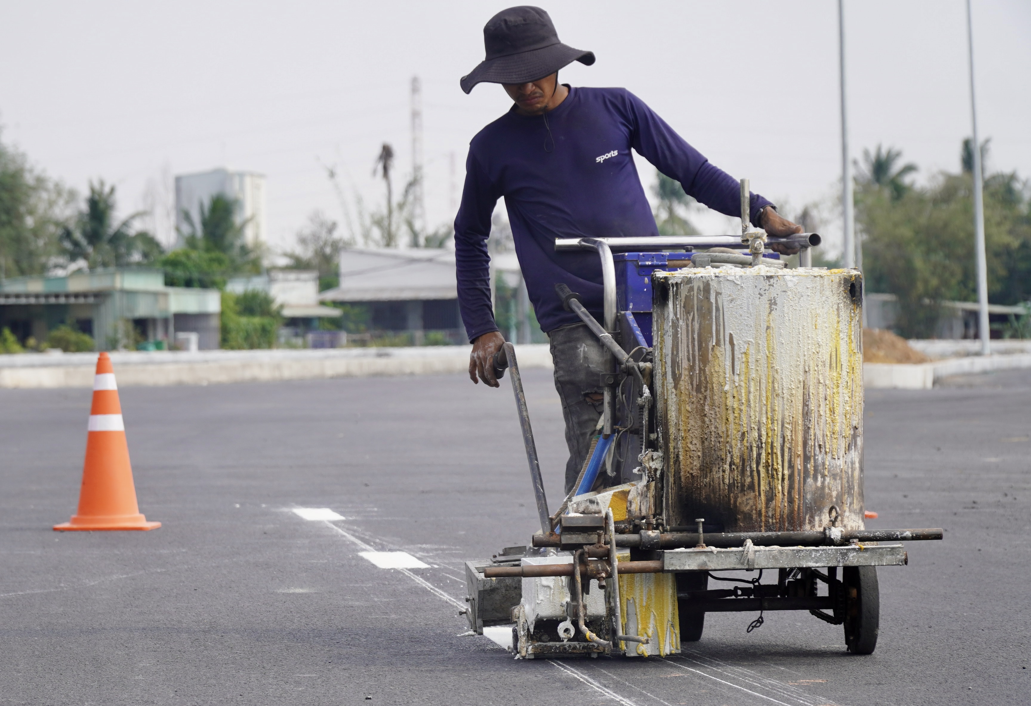 Nhánh đường này đang được công nhân thực hiện kẻ vẽ phân chia làn đường.
