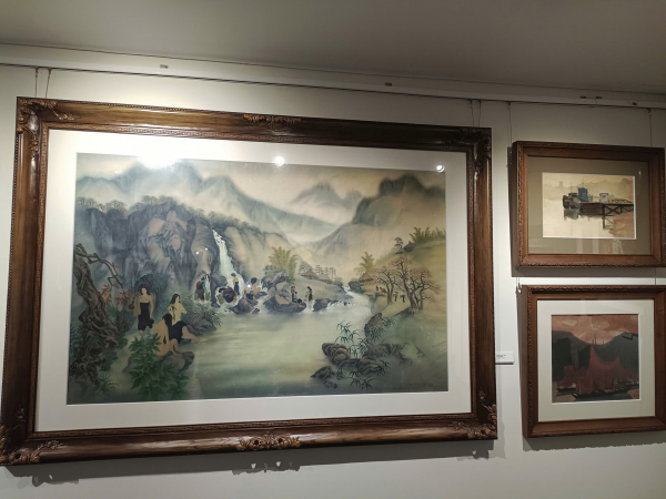 Tác phẩm "Tắm suối" của họa sĩ Mai Long cùng một số tác phẩm của các họa sĩ khác tại triển lãm.