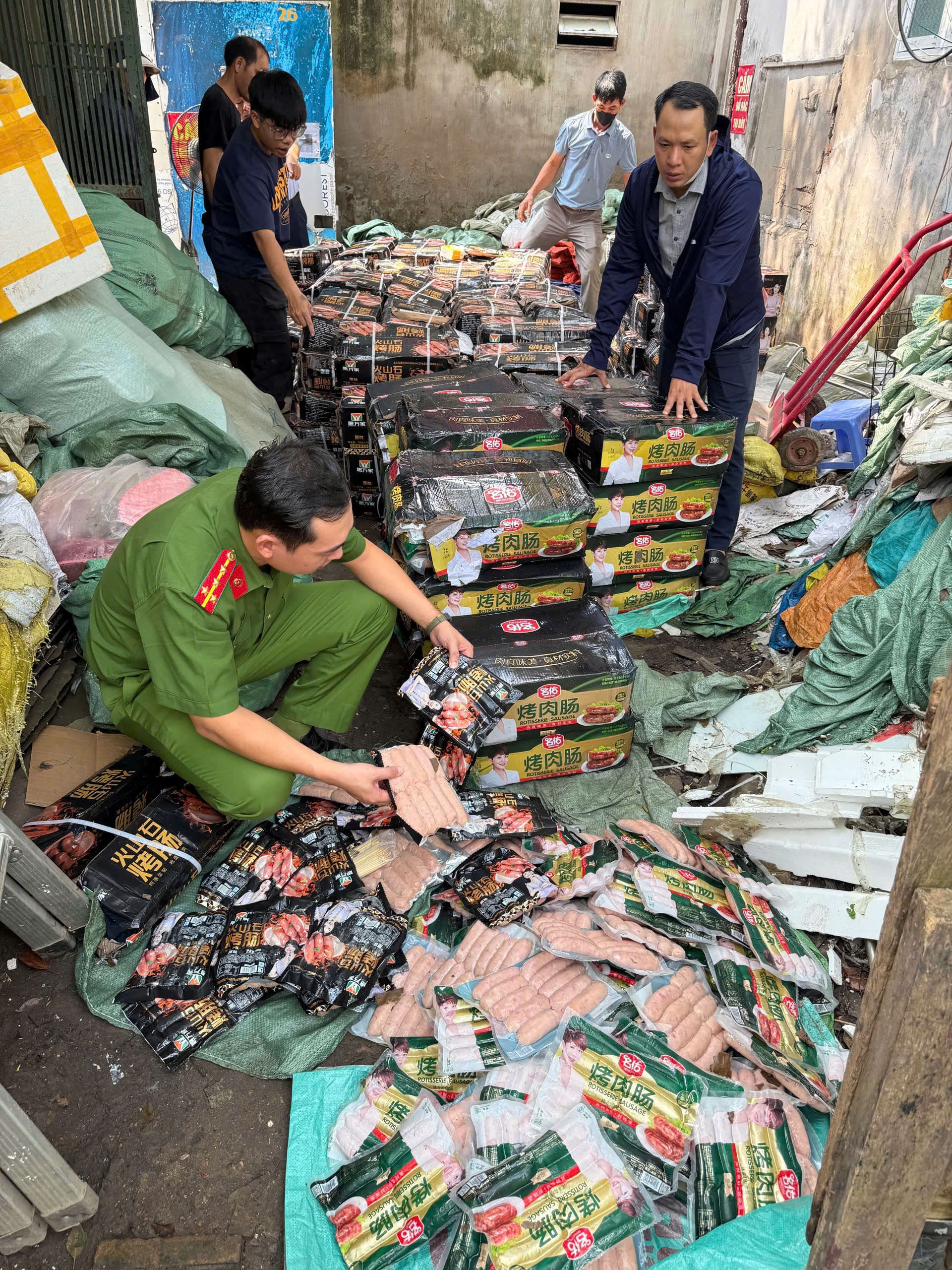 Ngày 9/10, Đội 4 Phòng Cảnh sát kinh tế CATP phối hợp Đội QLTT số 14 Thành phố kiểm tra một kho hàng tại ngõ 16 Đỗ Xuân Hợp, Phường Từ Liêm, Hà Nội, phát hiện gần 1,7 tấn xúc xích, được đóng gói trong túi bóng dán tem nhãn nước ngoài, không có tem nhãn phụ tiếng Việt, không có giấy tờ kiểm tra chất lượng vệ sinh an toàn thực phẩm.