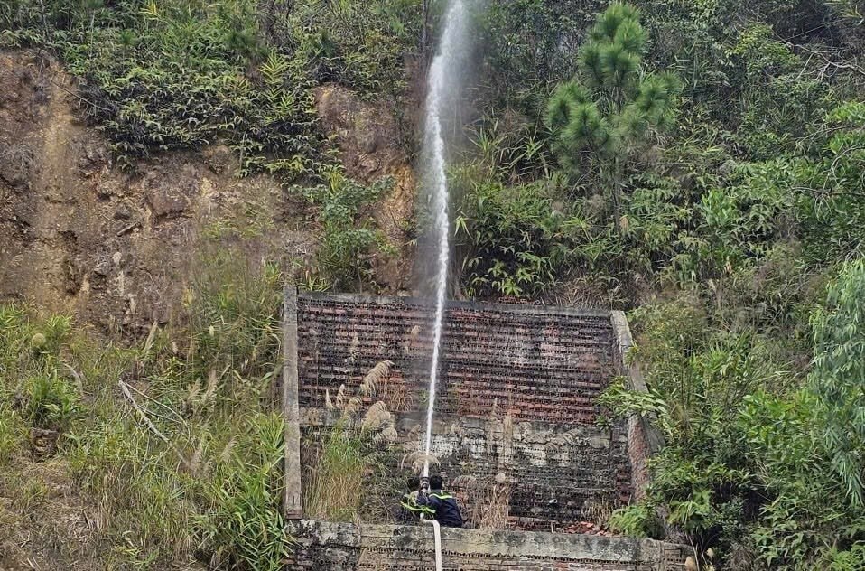 Lực lượng Cảnh sát PCCC&CNCH triển khai phun nước chữa cháy khu vực sườn đồi.