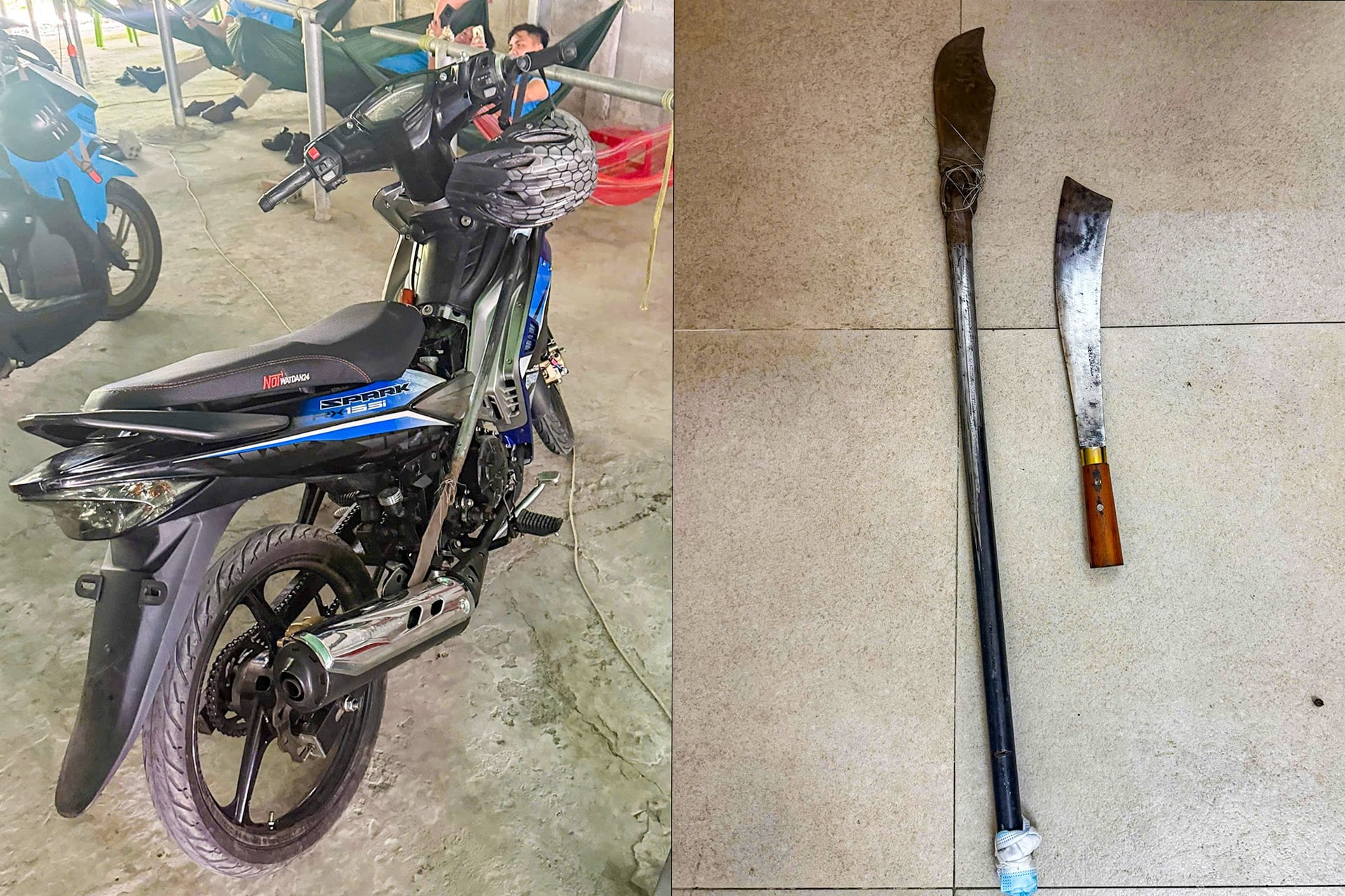 Tang vật thu giữ gồm: 2 con dao có lưỡi bằng kim loại sắc nhọn (chưa xác định chủng loại cụ thể), 01 xe mô tô nhãn hiệu SPARK RX 135i màu xanh đen không gắn biển số và 01 xe mô tô hiệu Honda Vario màu trắng xanh không gắn biển số.
