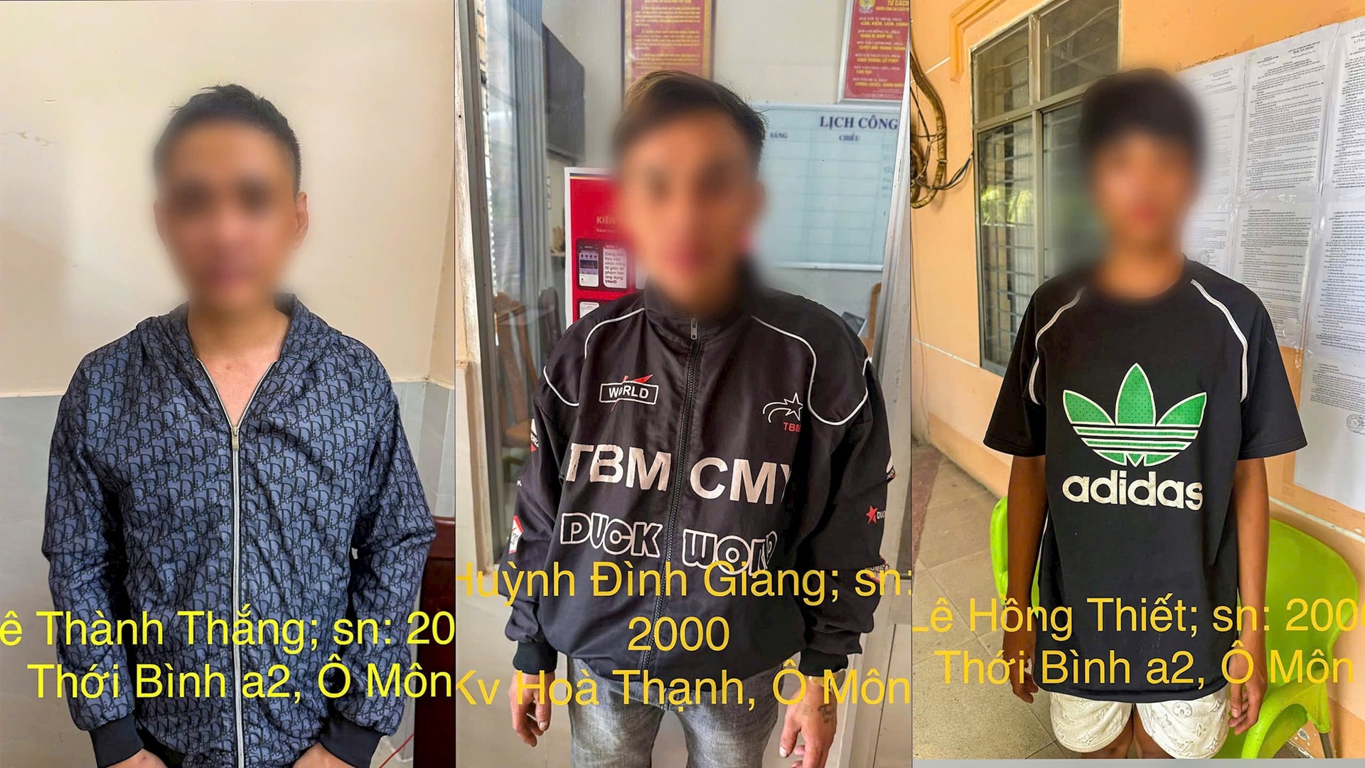 Danh tính các đối tượng được xác định gồm: Lê Thành Thắng (SN 2001, ngụ ấp Thới Bình A2, phường Ô Môn), Huỳnh Đình Giang (SN 2000, ngụ khu vực Hòa Thạnh, phường Ô Môn) và Lê Hồng Thiết (SN 2006, ngụ ấp Thới Bình A2, phường Ô Môn).