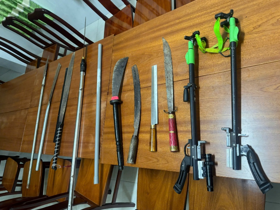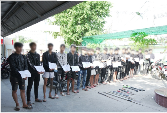 Tại thời điểm bị phát hiện, các đối tượng dùng khẩu trang và vật dụng che chắn biển số xe nhằm tránh truy vết của camera và cơ quan chức năng. Công an phường đã tiến hành thu giữ 07 xe máy, 02 súng bắn bi, 08 dao tự chế và 01 ống nhựa tròn. Qua kiểm tra, phát hiện N.T.H (SN 2010) dương tính với ma túy.