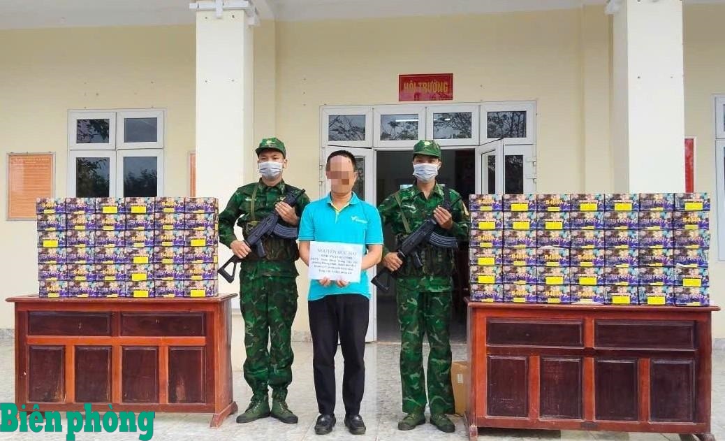 Đối tượng N.Đ.H và số pháo nổ bị Đồn Biên phòng cửa khẩu Hoàng Diệu bắt giữ. Ảnh: Đơn vị cung cấp