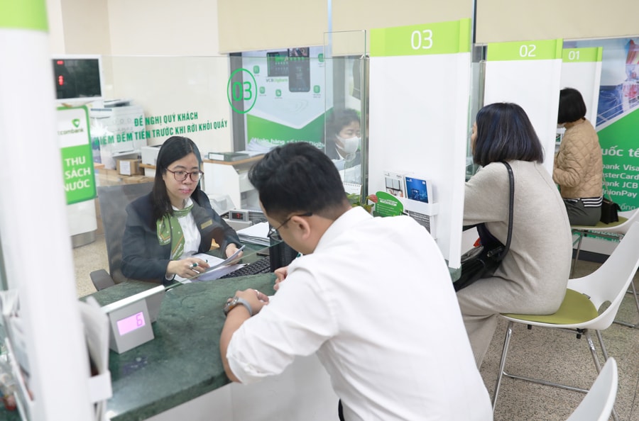 Khách hàng giao dịch tại Ngân hàng Thương mại cổ phần Ngoại thương Việt Nam. Ảnh: Quang Thái