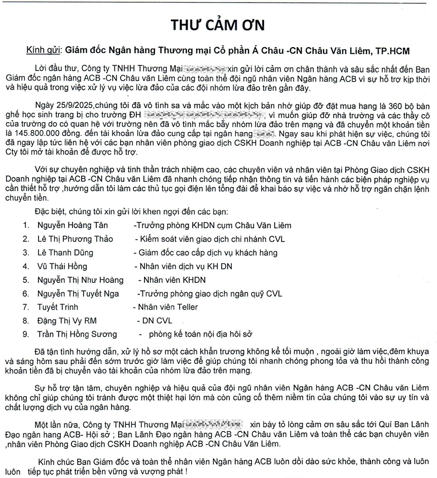 Thư cảm ơn của khách hàng gửi đến ACB.