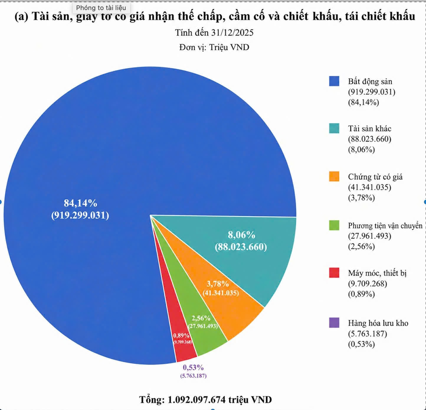 Tại nhiều ngân hàng, bất động sản tiếp tục là loại tài sản thế chấp chủ đạo. Theo báo cáo tài chính của Sacombank, tại thời điểm cuối năm 2025, tổng giá trị tài sản đảm bảo cho các khoản vay đạt hơn 1,09 triệu tỷ đồng, tăng 14,5% so với đầu năm và bằng 174% dư nợ vay tín dụng.
