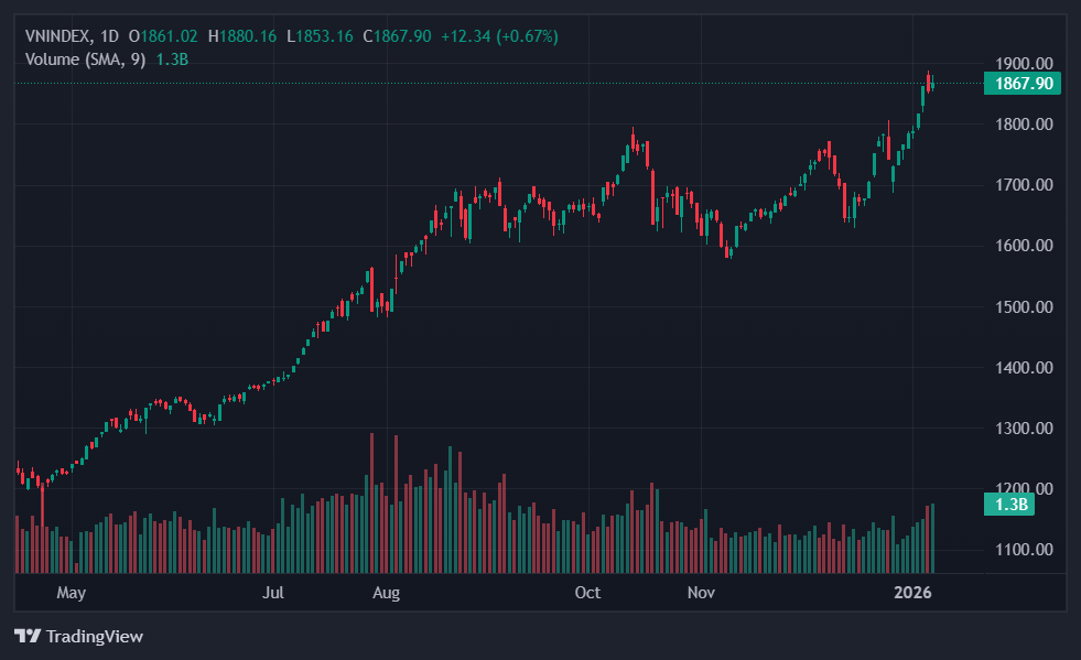 VN-Index tiếp tục đóng cửa ở mức cao nhất lịch sử. Ảnh: TradingView.