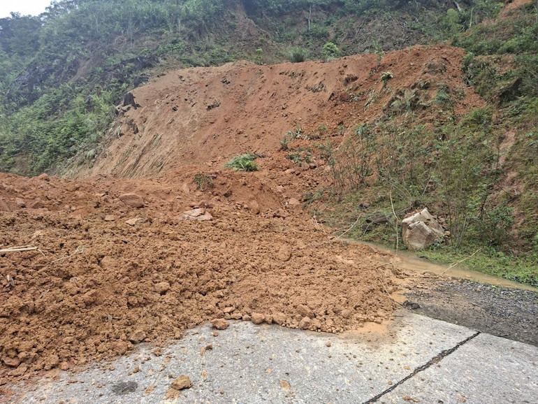 Điểm sạt lở đất tại Km 201+500, đường Hồ Chí Minh nhánh tây, gần Khu bảo tồn thiên nhiên Bắc Hướng Hóa, Quảng Trị trong cơn bão số 10 vừa qua. (Ảnh: HIẾU MINH)