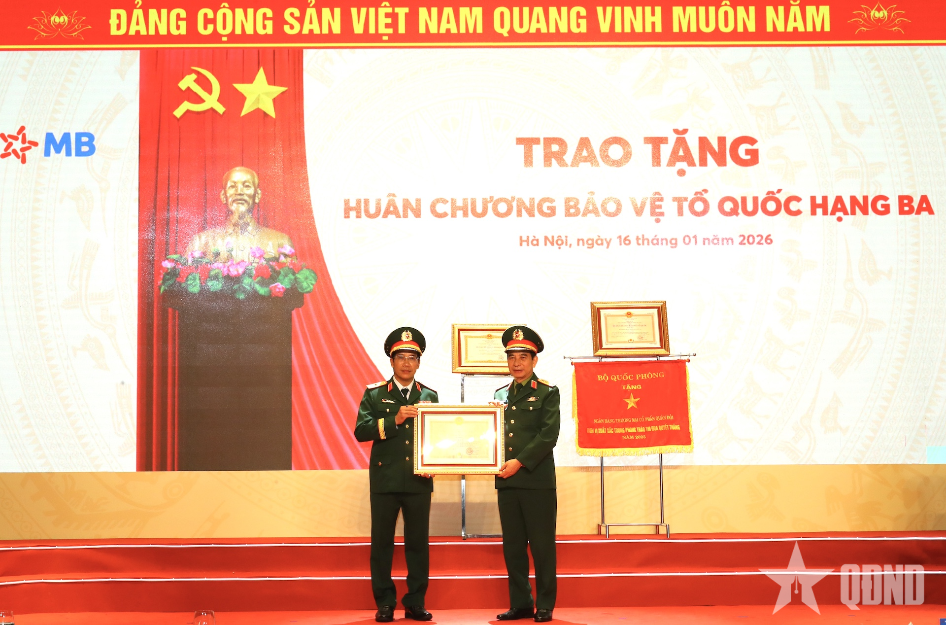 Thay mặt lãnh đạo Đảng, Nhà nước, Đại tướng Phan Văn Giang trao Huân chương Lao động hạng Ba tặng Ngân hàng Thương mại cổ phần Quân đội (MB). Ảnh: PHƯƠNG THẢO