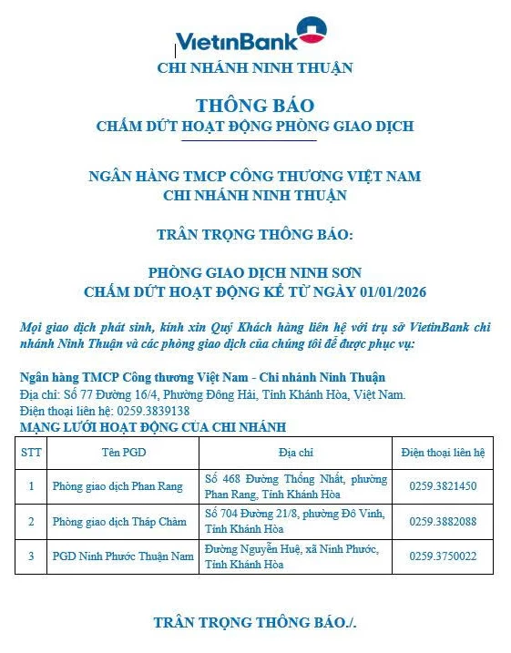 Ngân hàng TMCP Công thương Việt Nam - Chi nhánh Ninh Thuận: Thông báo chấm dứt hoạt động phòng giao dịch