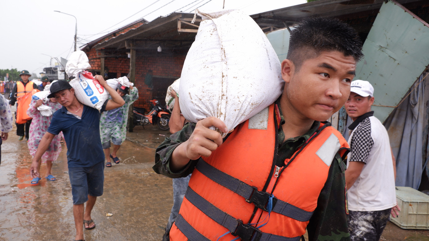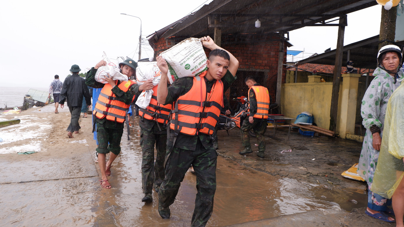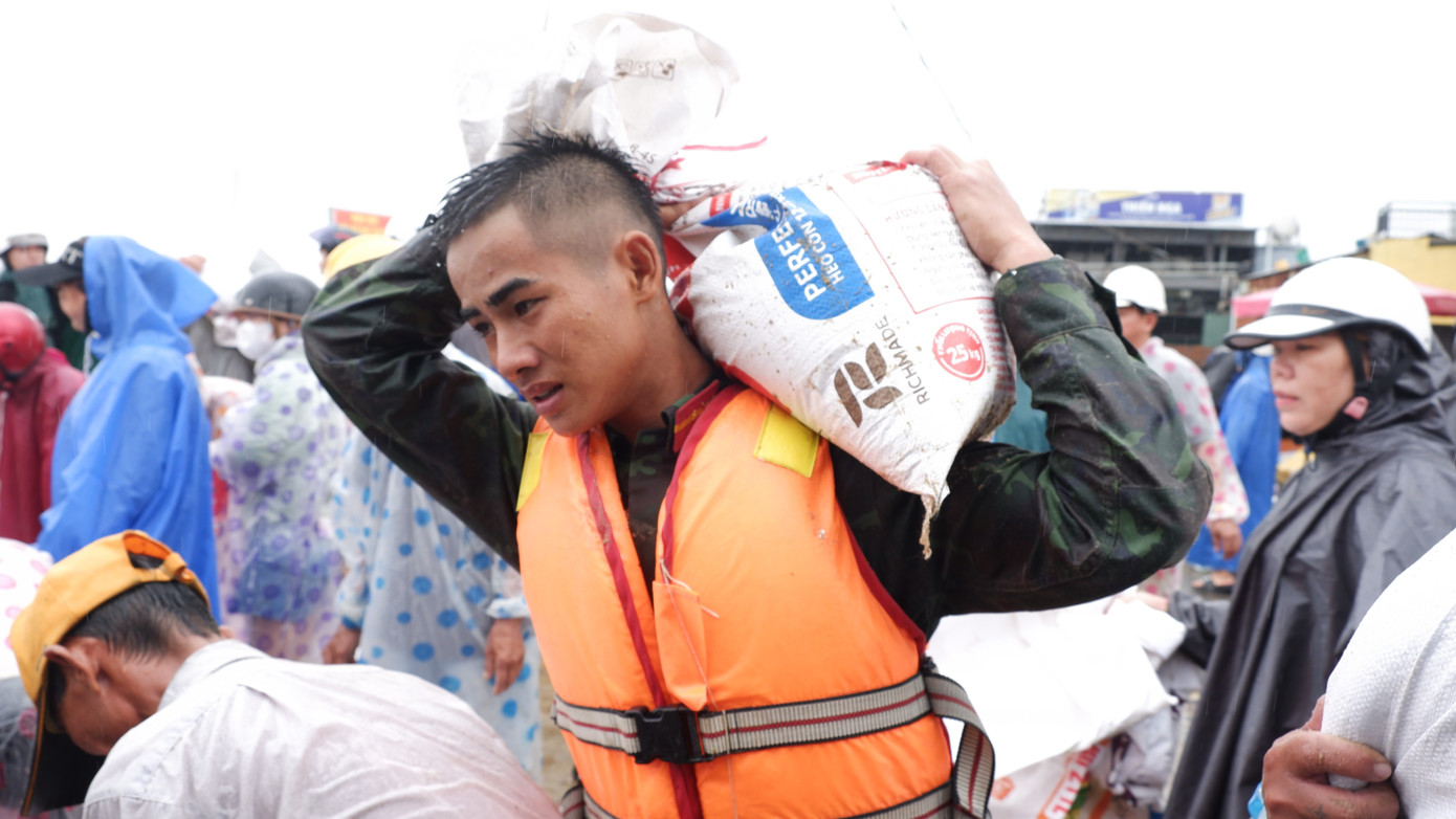 Hàng trăm cán bộ, chiến sĩ của Quân khu 5 và Đồn Biên phòng Cửa Đại không quản mưa gió, cùng người dân vác từng bao cát ngăn xói lở.