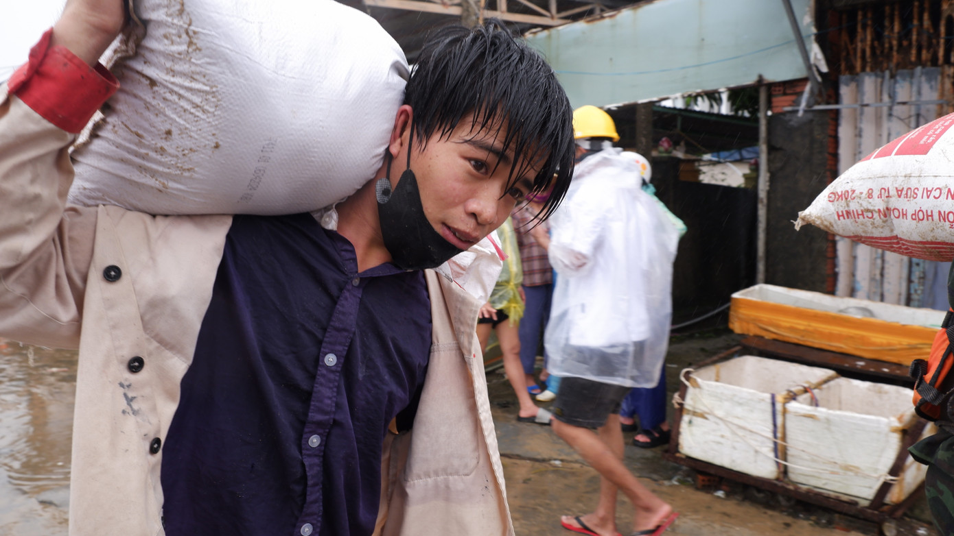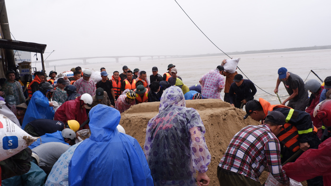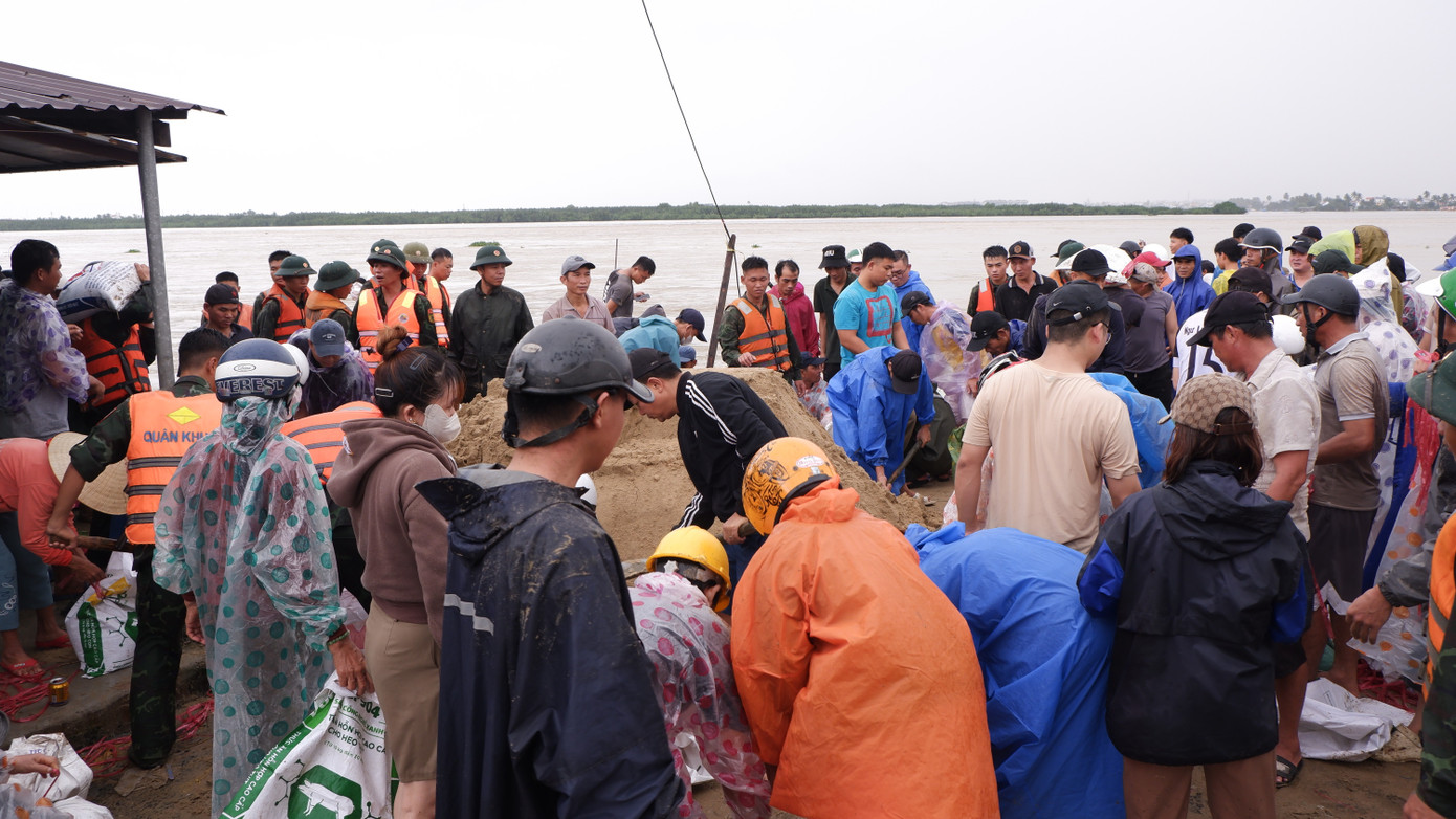 Hàng trăm cán bộ, chiến sĩ của Quân khu 5 và Đồn Biên phòng Cửa Đại không quản mưa gió, cùng người dân vác từng bao cát ngăn xói lở.