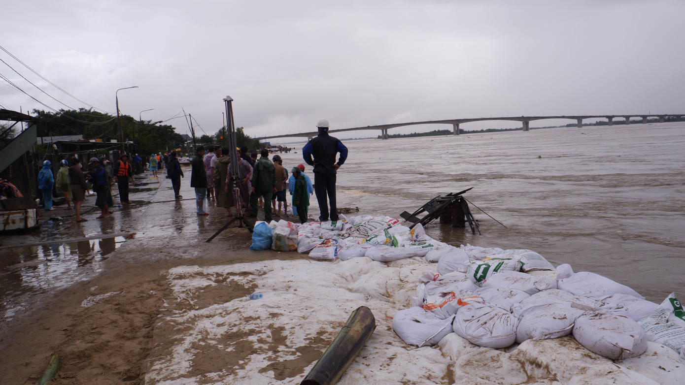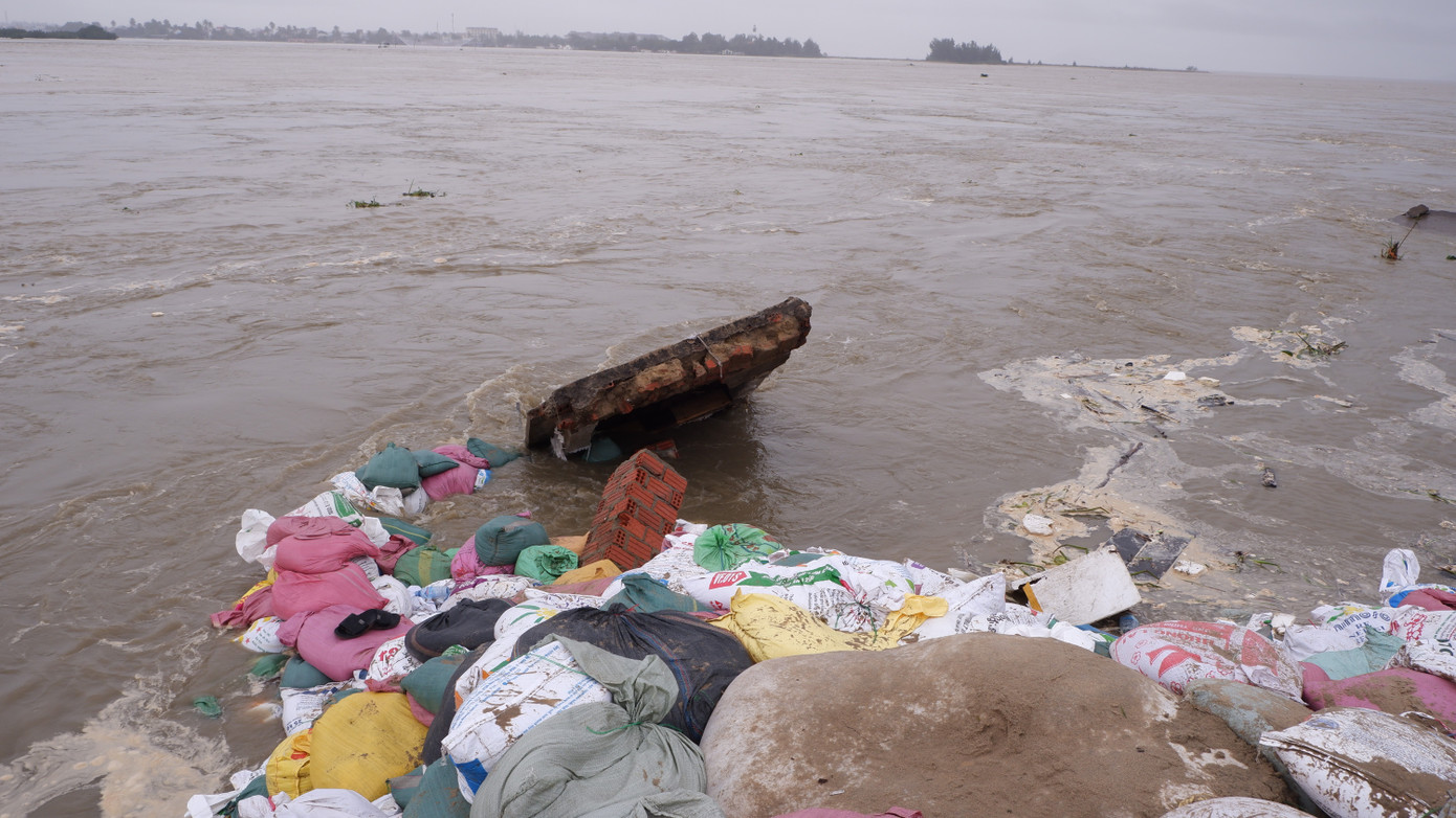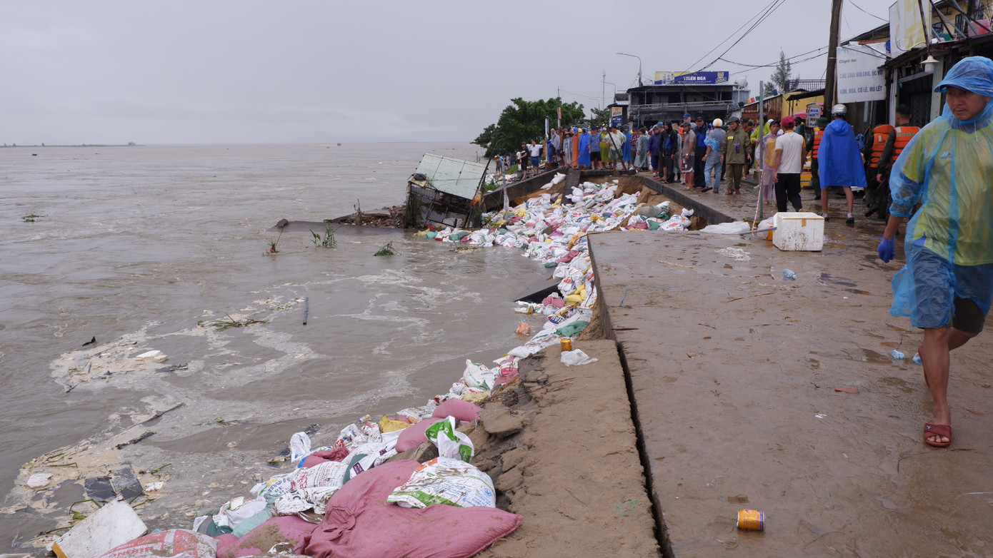 Những ngày qua, nước lũ sông Thu Bồn đổ ra biển Cửa Đại đã gây xói lở gần 1km bờ kè tại xã Duy Nghĩa (TP Đà Nẵng). Trong suốt 2 ngày qua (từ ngày 28-30/10), lực lượng quân đội, biên phòng cùng hàng ngàn người dân đã nỗ lực gia cố nhằm cứu bờ kè trước những đợt sóng lớn, tuy nhiên các điểm sạt lở vẫn tiếp tục xuất hiện, uy hiếp an toàn của hơn 300 hộ dân sống.