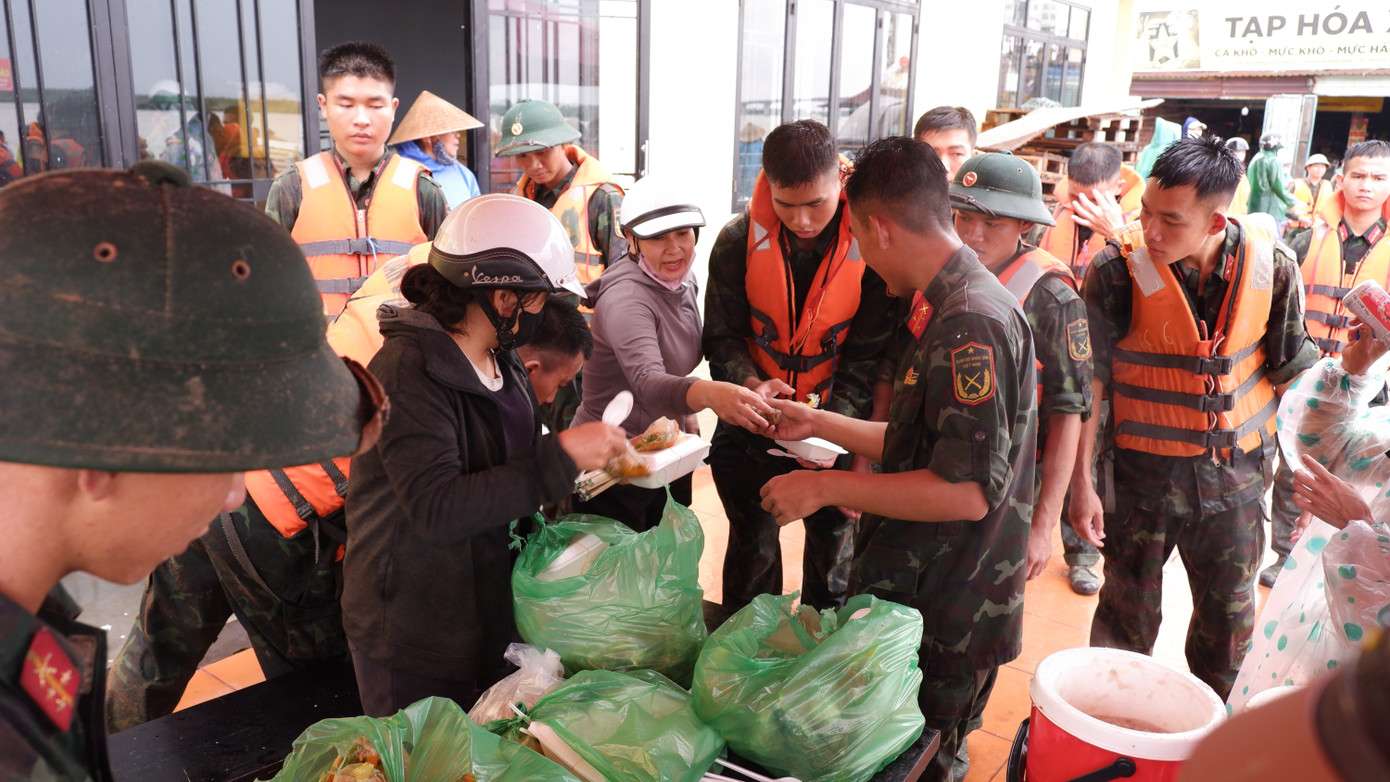 Người dân địa phương 2 ngày qua đã gọi nhau cùng nấu ăn tại chỗ để phục vụ cán bộ chiến sĩ, lực lượng tham gia ứng cứu tuyến bờ kè.