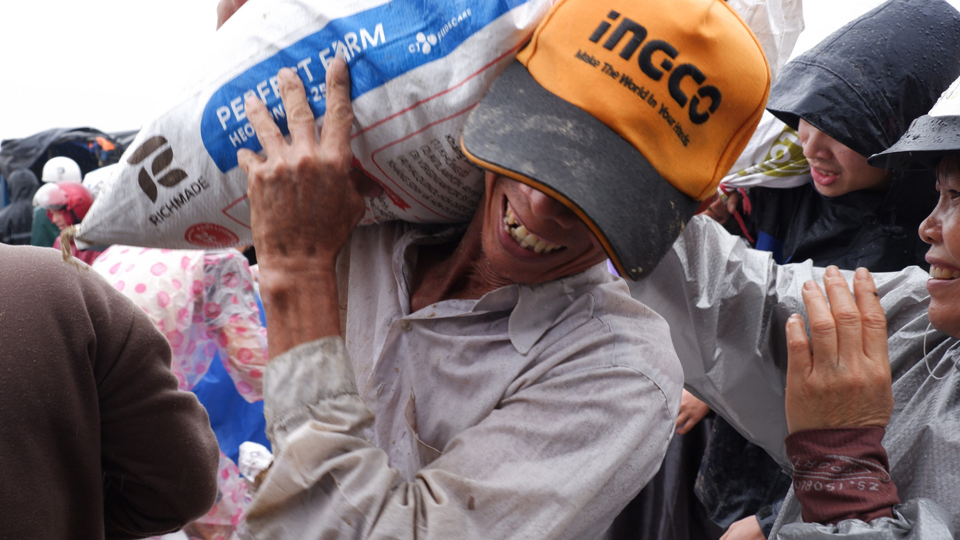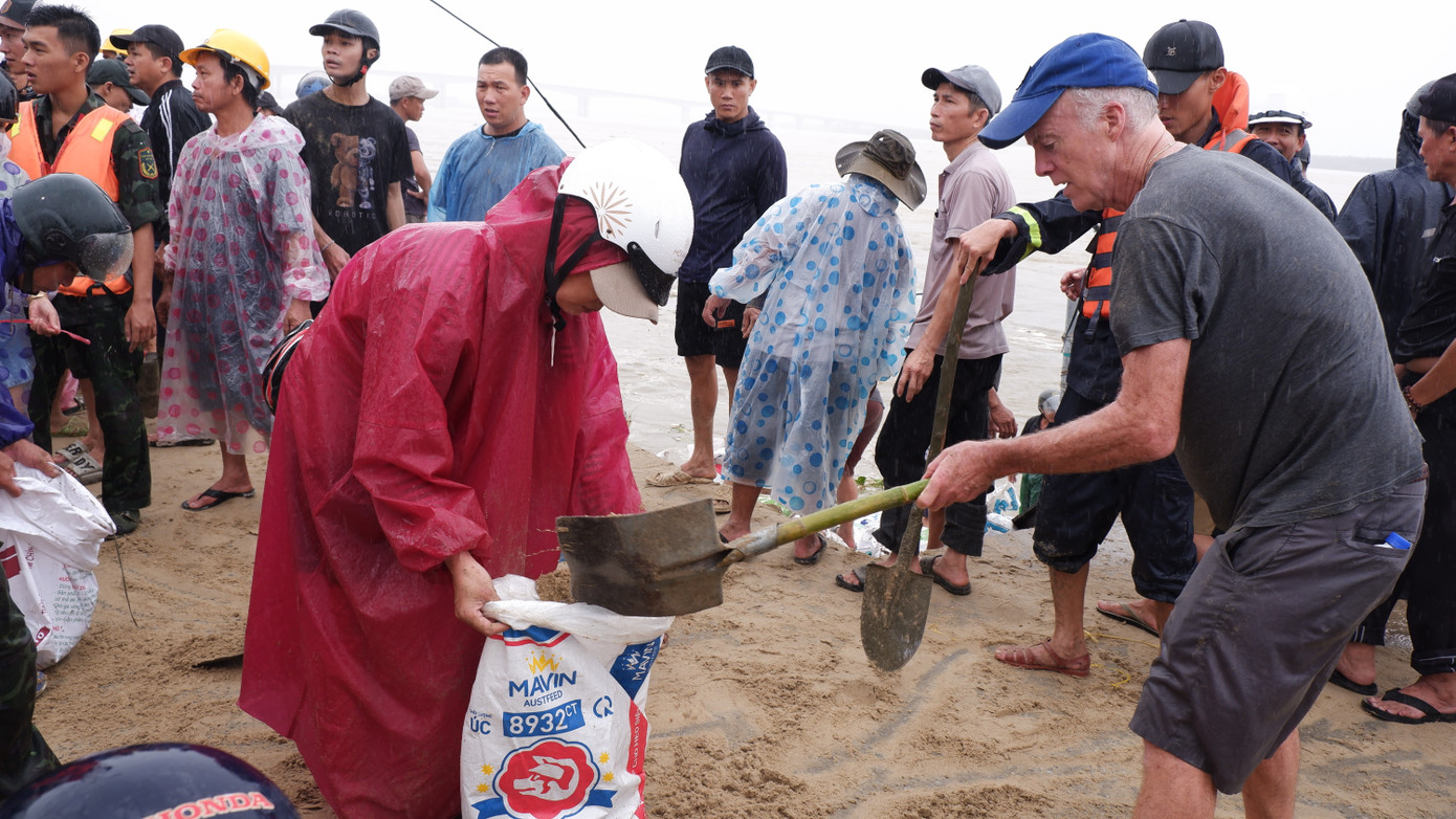 Một du khách nước ngoài cùng chung tay giúp người dân và chính quyền gia cố tuyến bờ kè ở xã Duy Nghĩa.