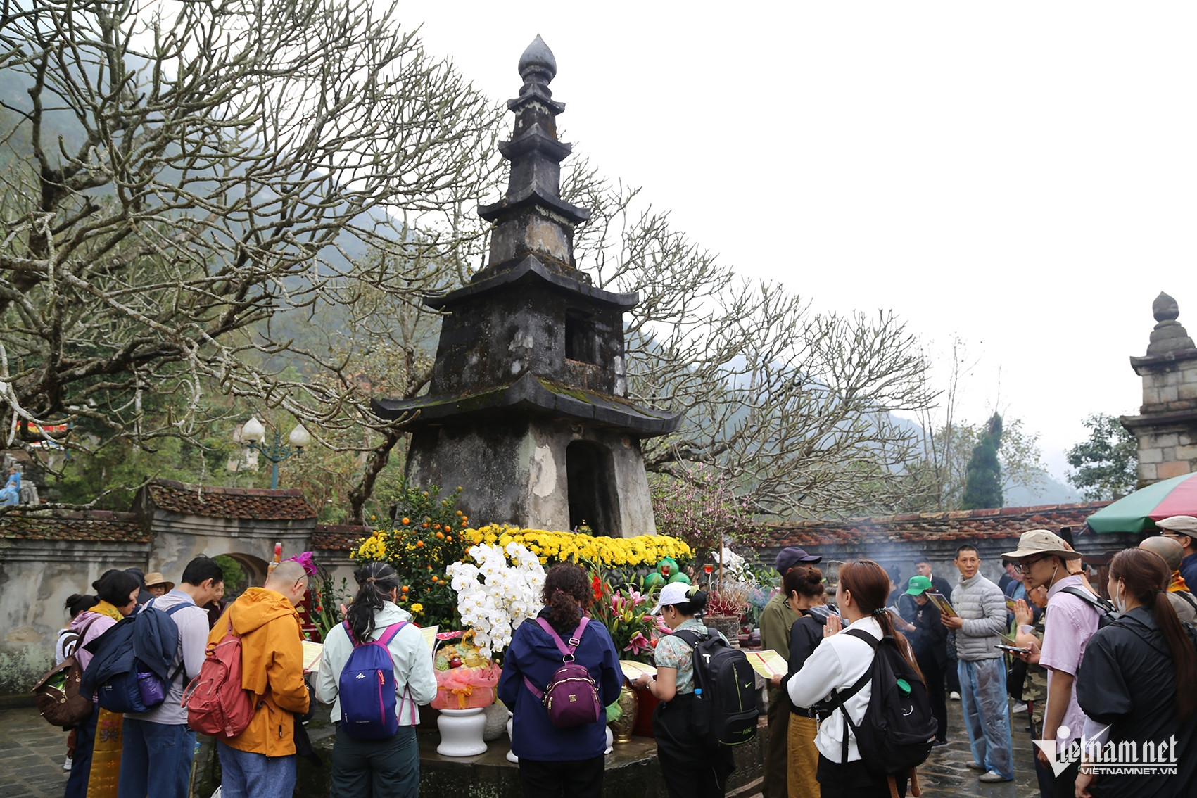 Khu vực chùa Đồng đông nghịt người mặc dù gió lớn kèm mưa phùn.