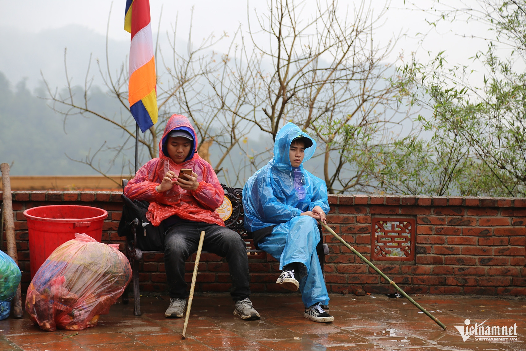 Do thời tiết mưa phùn ẩm ướt kèm sương mù nên rất đông du khách mặc áo mưa để leo lên đỉnh thiêng.