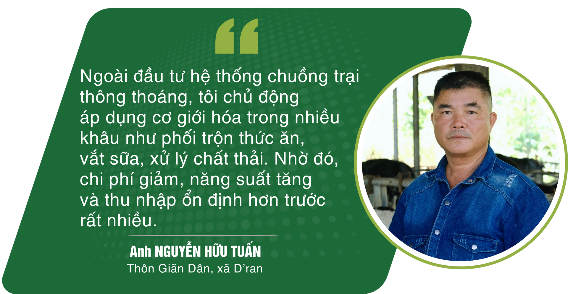 Gia đình anh Tuấn hiện có hơn 300 con bò, trong đó hơn 120 con đang khai thác sữa, mỗi ngày cho sản lượng từ 2,3 - 2,5 tấn. Thực hiện chăn nuôi, anh đã đầu tư hệ thống chuồng trại thông thoáng, áp dụng cơ giới hóa trong nhiều khâu như phối trộn thức ăn, vắt sữa, xử lý chất thải. Nhờ đó, chi phí giảm, năng suất tăng và thu nhập ổn định hơn trước rất nhiều.