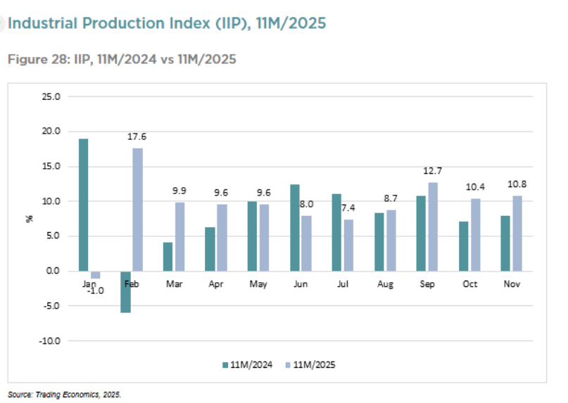 Trong năm 2025, hoạt động sản xuất duy trì đà tăng trưởng, với sản xuất công nghiệp tiến gần mức hai chữ số. Đồng thời, dòng vốn đầu tư trực tiếp nước ngoài (FDI) vẫn duy trì ổn định bất chấp những biến động của kinh tế toàn cầu.
