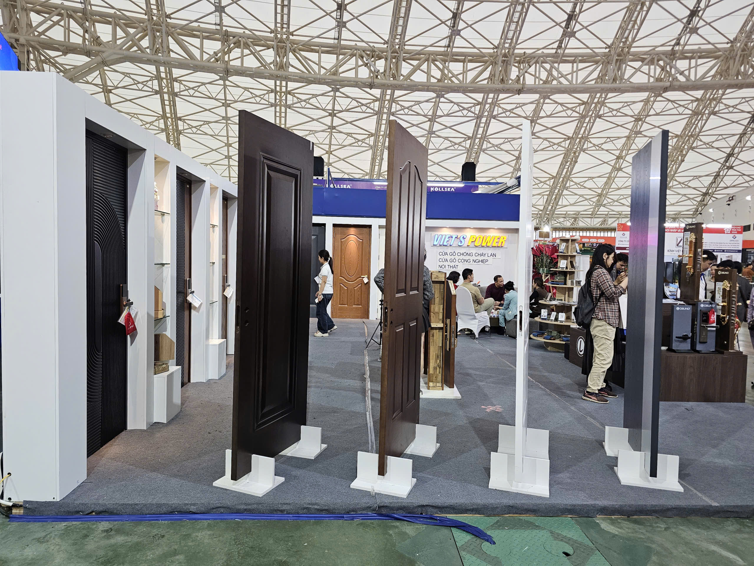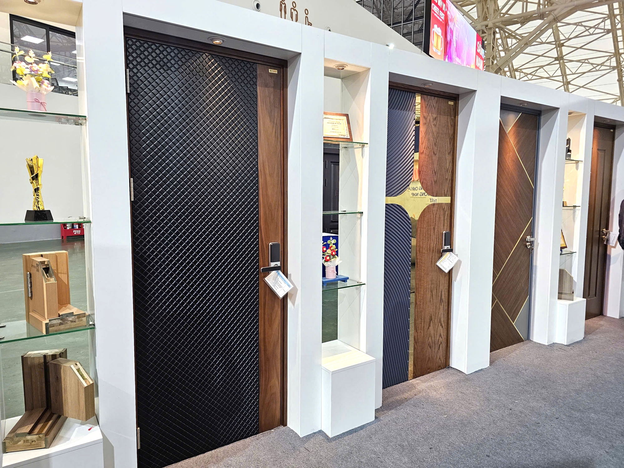 Ngoài các sản phẩm cửa nhôm, các sản phẩm cửa gỗ công nghiệp, cửa gỗ chống cháy lan cũng được quan tâm với đa dạng mẫu mã. Theo giới thiệu của bà Nguyễn Thị Bình, Phó tổng giám đốc Công ty CP Viet’s Power, tại triển lãm, công ty trưng bày các sản phẩm tiêu biểu, nổi bật với dòng cửa gỗ có thiết kế giống như gỗ tự nhiên nguyên khối. Sản phẩm không chỉ đảm bảo tính thẩm mỹ mà còn tích hợp khả năng ngăn cháy, ngăn khói, giúp người sử dụng có thêm từ 30 đến 90 phút an toàn để tránh trú khi xảy ra hỏa hoạn.