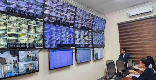 Cán bộ kỹ thuật đường sắt giám sát hệ thống thông tin tín hiệu camera tại các đường ngang nhằm cảnh báo an toàn chạy tàu. (Ảnh: Việt Hùng/Vietnam+)