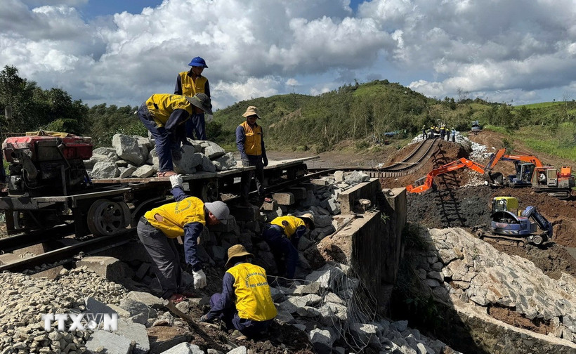 Các công nhân gia cố phần móng đường sắt bị sạt lở do bão số 13 ở xã Xuân Lãnh (tỉnh Đắk Lắk) . (Ảnh: Tường Quân/TTXVN)