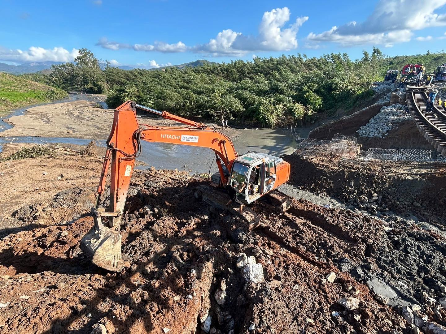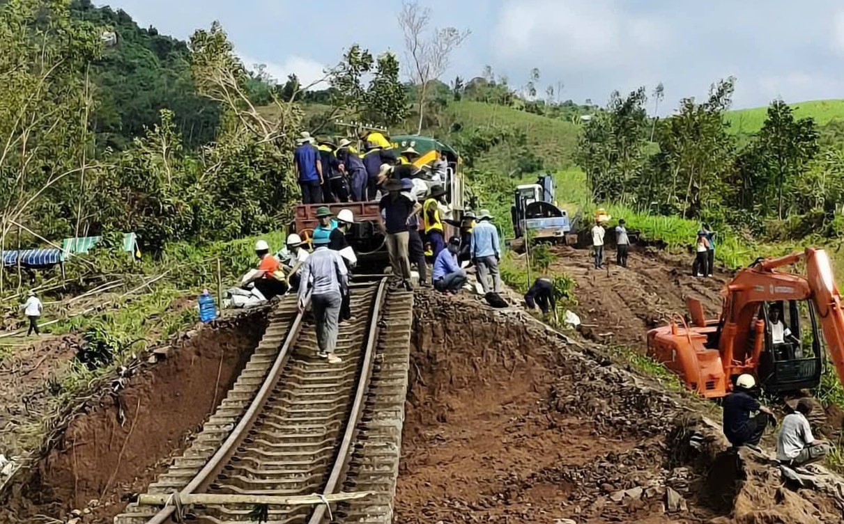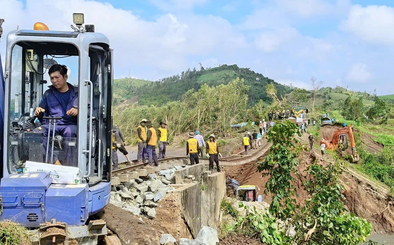 Cùng thời điểm này, ngành Đường sắt đang dốc toàn lực, cả người và phương tiện, để khắc phục điểm sạt lở nền đường do mưa trong bão số 13 gây ra tối 6-11, khiến nền đường sắt tại Km 1136+800 đến Km 1136+925 khu gian Vân Canh - Phước Lãnh bị sạt lở, sâu đến 9m.