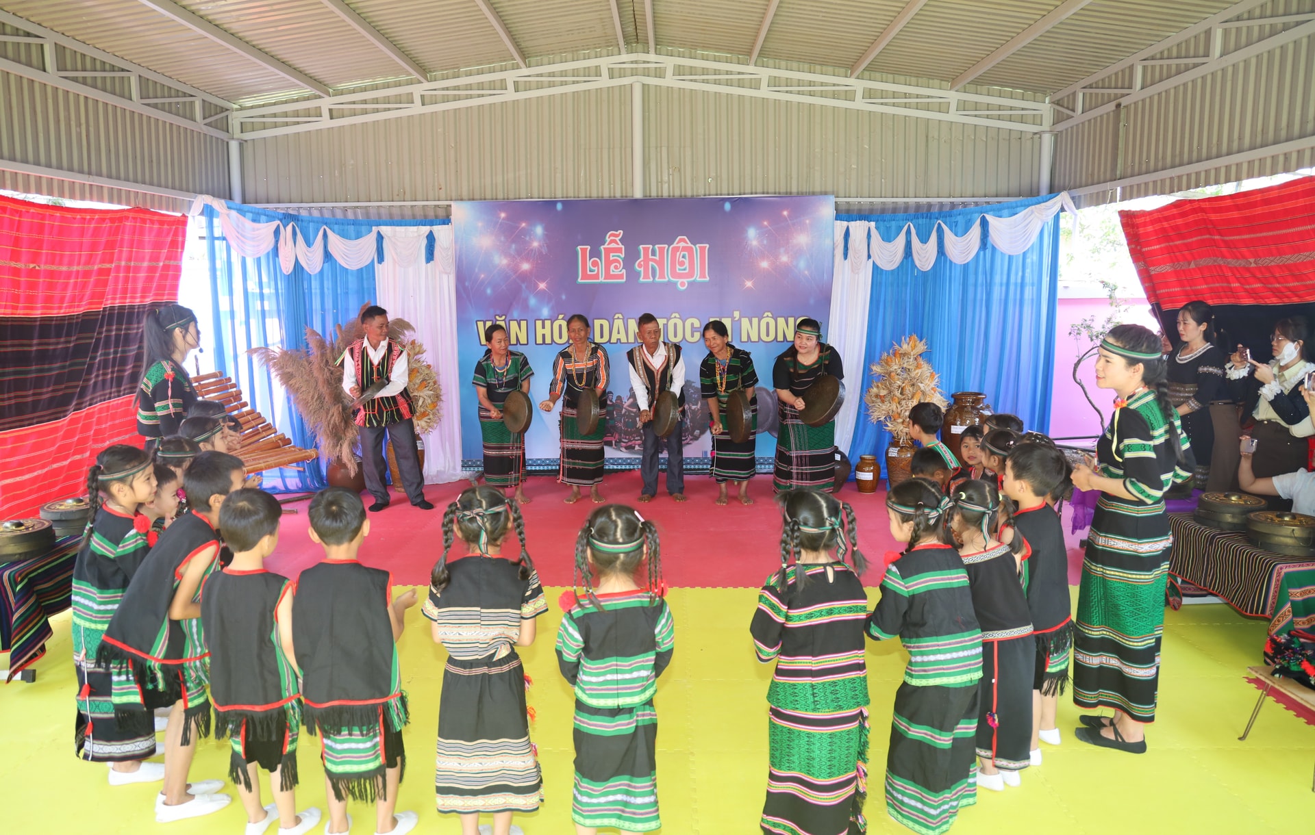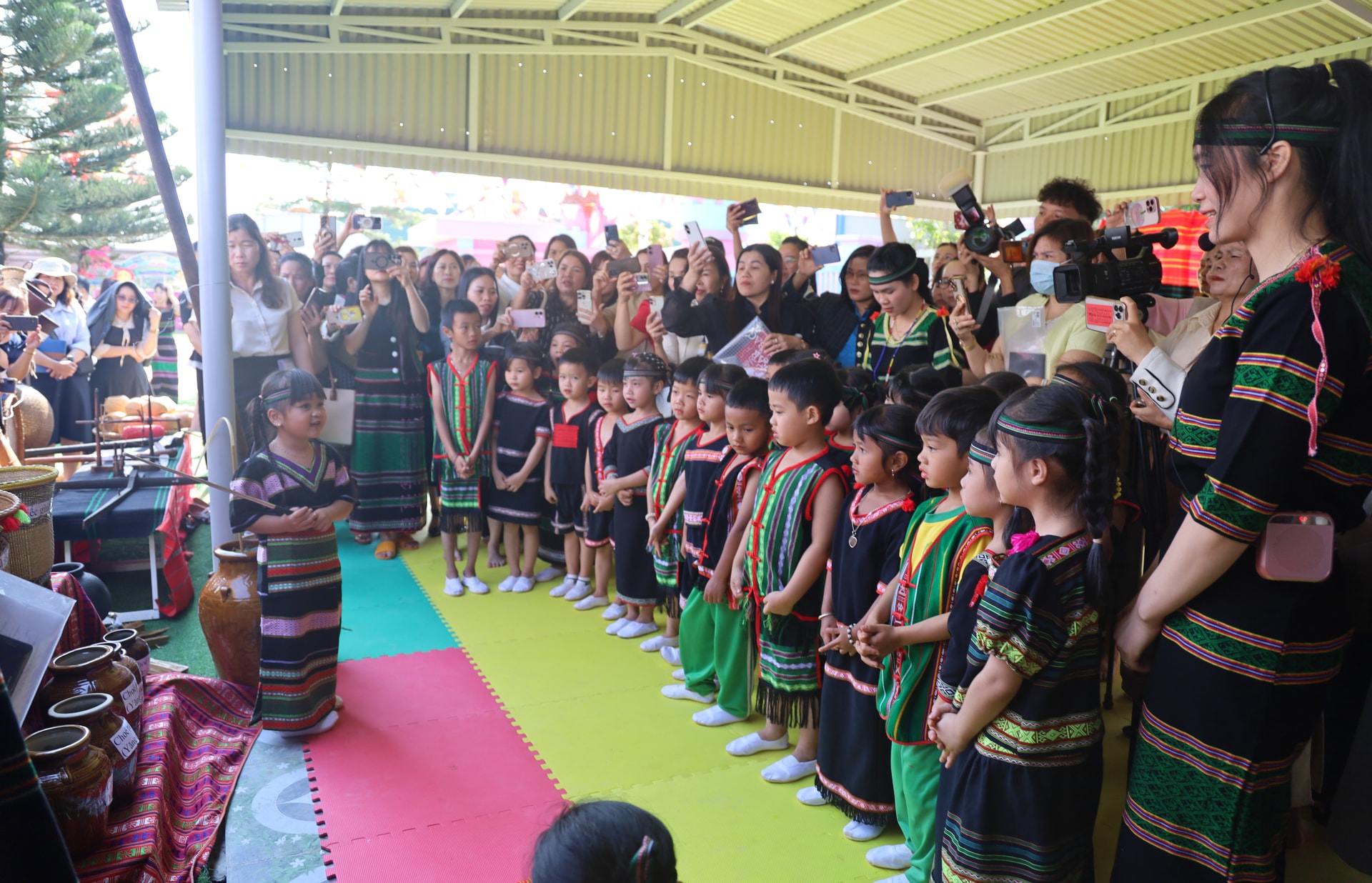 Giáo viên tăng cường tiếng Việt cho trẻ thông qua tổ chức cho trẻ trải nghiệm đánh cồng chiêng với các nghệ nhân trên địa bàn