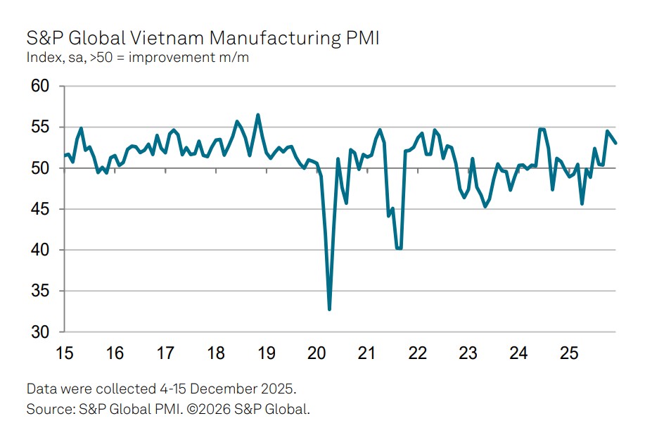 Chỉ số PMI ngành sản xuất trong tháng 12/2025 đạt 53,0 điểm, giảm nhẹ so với mức 53,8 điểm của tháng 11 nhưng vẫn duy trì trên ngưỡng 50 điểm, cho thấy sức khỏe của ngành tiếp tục được cải thiện. Đây cũng là tháng thứ 6 liên tiếp các điều kiện kinh doanh ghi nhận xu hướng tích cực.