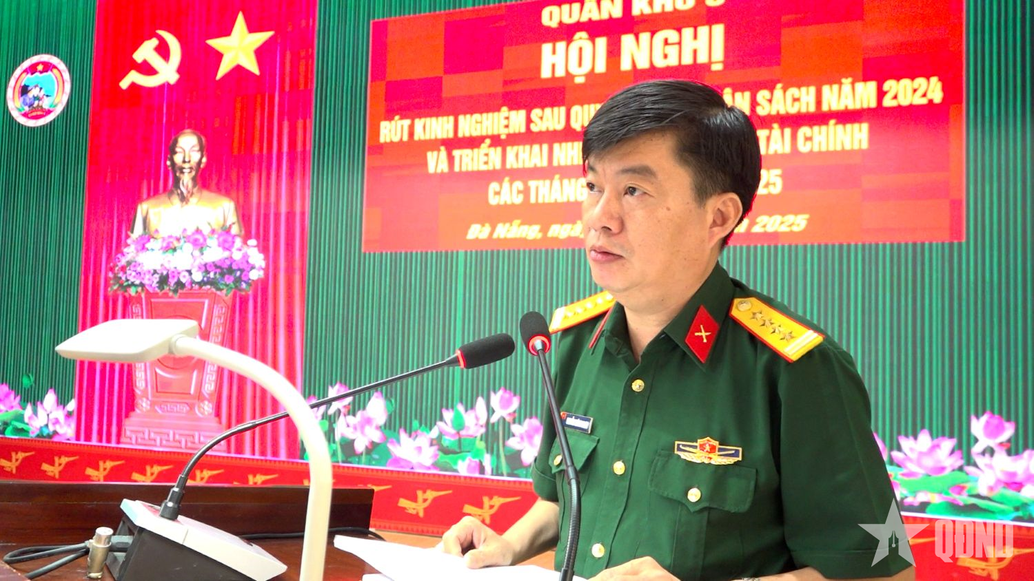 Đại tá Nguyễn Thành Nhơn, Trưởng Phòng Tài chính Quân khu 5 phát biểu tại Hội nghị rút kinh nghiệm sau quyết toán và triển khai nhiệm vụ công tác tài chính năm 2025. Ảnh: TRỊNH VĂN