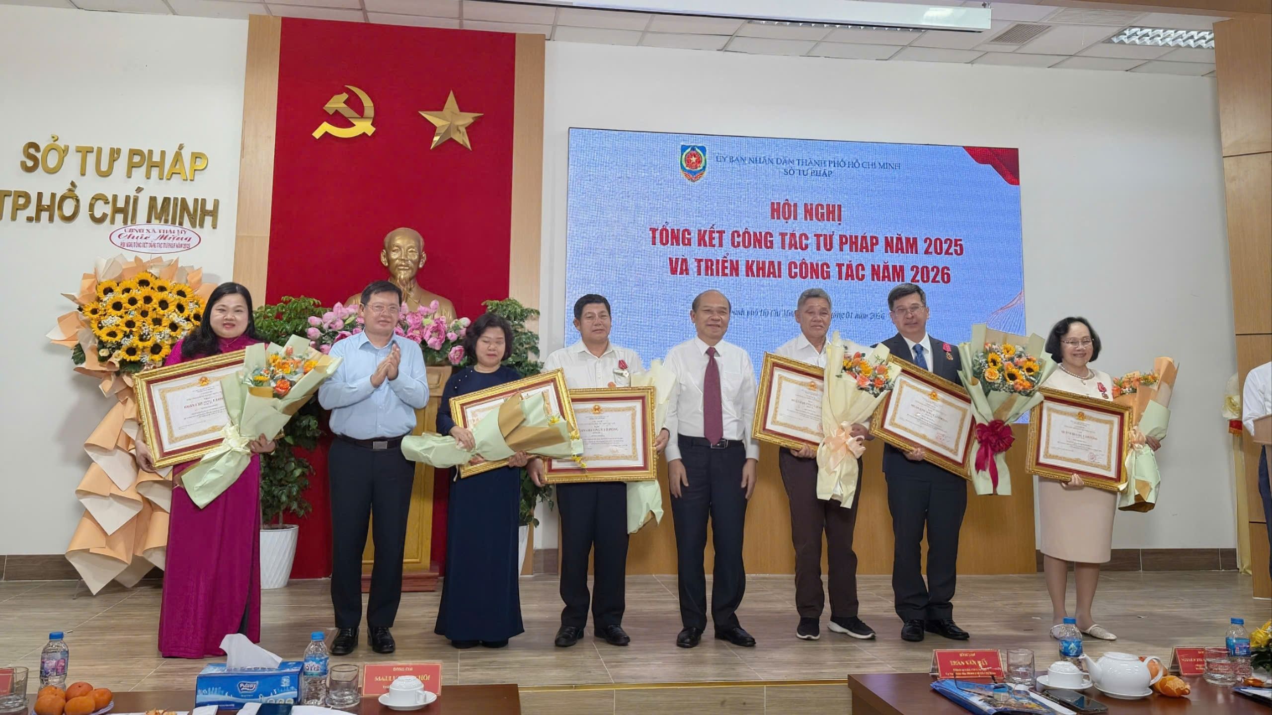 Lãnh đạo Bộ Tư pháp và lãnh đạo UBND TPHCM trao Huân chương Lao động và hoa cho các tập, thể cá nhân. Ảnh: CẨM NƯƠNG