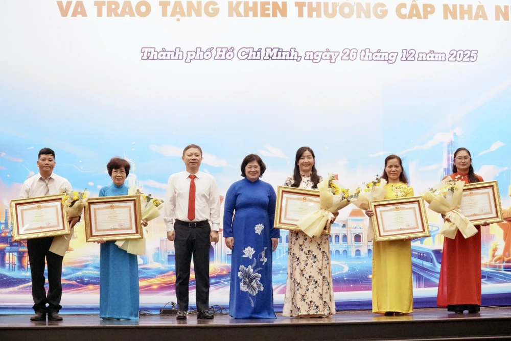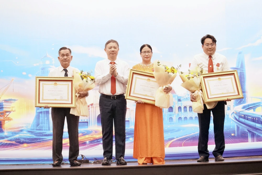 Lãnh đạo Thành ủy TP.HCM trao bằng khen của Thủ tướng Chính phủ, Huân chương Lao động hạng Ba cho các tập thể, cá nhân. Ảnh: BẢO PHƯƠNG