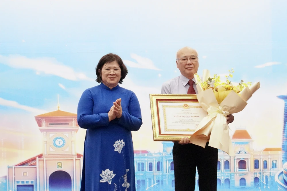 Phó Bí thư Thành ủy TP.HCM Văn Thị Bạch Tuyết trao Huân chương Lao động hạng Nhất cho ông Phan Nguyễn Như Khuê, nguyên Trưởng Ban Tuyên giáo Thành ủy TP.HCM. Ảnh: BẢO PHƯƠNG